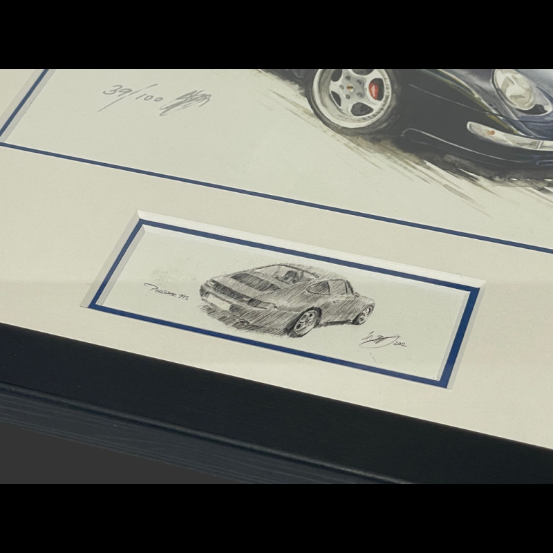 Porsche Rahmen 911 Coupe Typ 993 1998 Schwarzer Holzrahmen mit Skizze 25 x 30 cm - Uli Ehret
