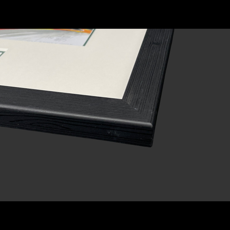 Mit schwarz lackiertem Holzrahmen, doppelter Passepartout und Schutzglas