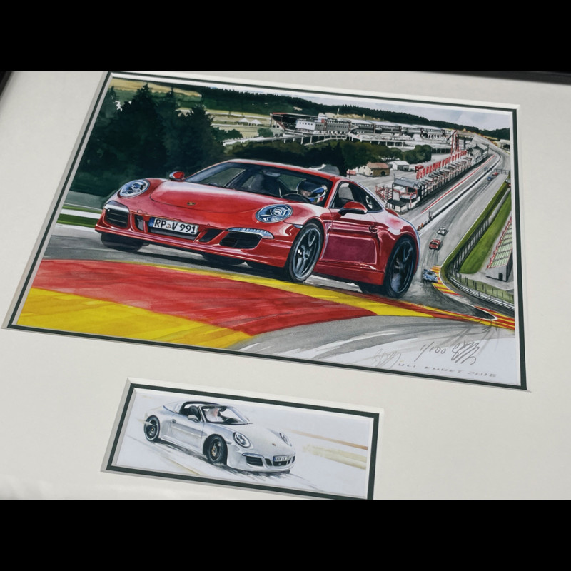 Porsche Rahmen 911 Coupe Typ 991 2019 Porsche Speed Cup Spa  Schwarzer Holzrahmen mit Skizze 25 x 30 cm - Uli Ehret