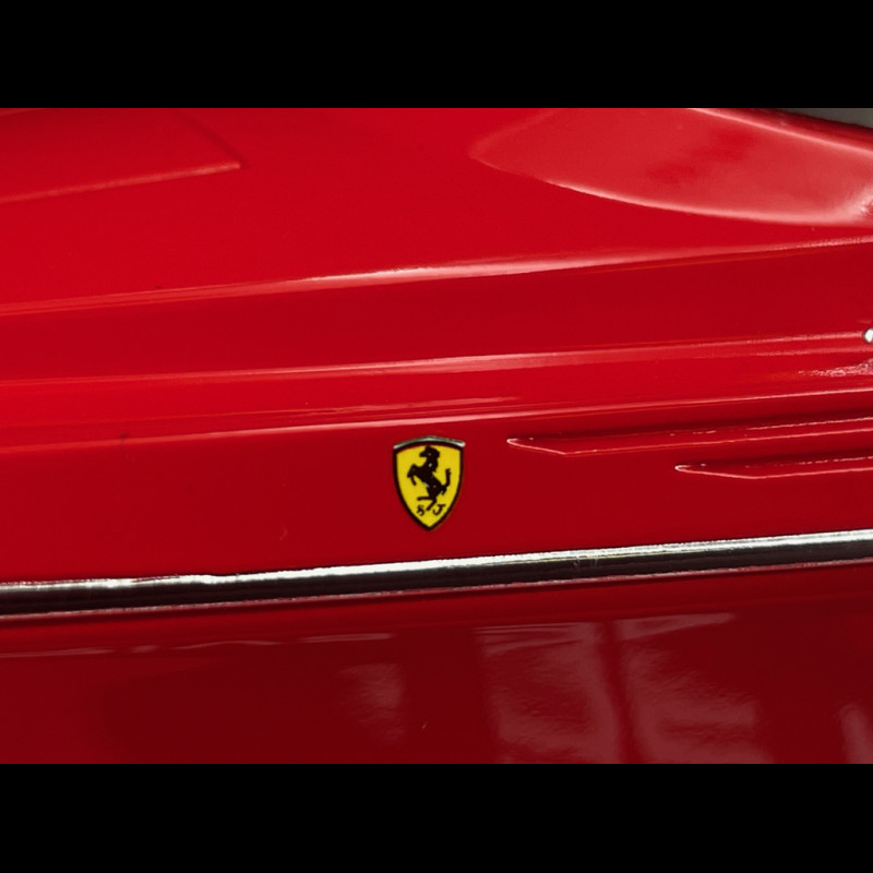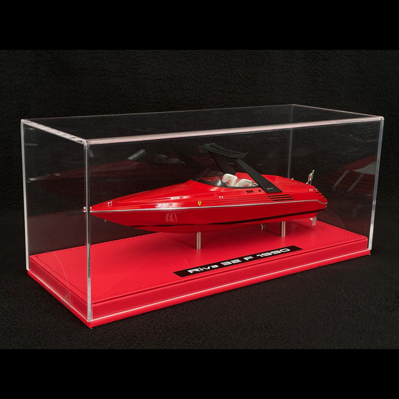 Dieses Modell des Riva 32 Ferrari Motorboots von 1990 im Maßstab 1:43 von Kess Model ist eine detailgetreue Nachbildung des berühmten roten Schnellboots aus der Kooperation von Riva und Ferrari. Angetrieben wird es von zwei V8-Motoren mit insgesamt 780 PS. Das aus Resin gefertigte Modell ist auf einem Sockel montiert und wird in einer Vitrine geliefert. Es ist in diesem Maßstab ca. 24 cm lang und besticht durch sein flaches Profil, den spitzen Bug, das sonnenliegenartige Achterdeck und die vom Testarossa inspirierten Details (seitliche Lufteinlässe, leuchtend rote Signatur). Damit ist es ein originelles Sammlerstück für alle, die sich für Ferrari oder italienisches Design begeistern.