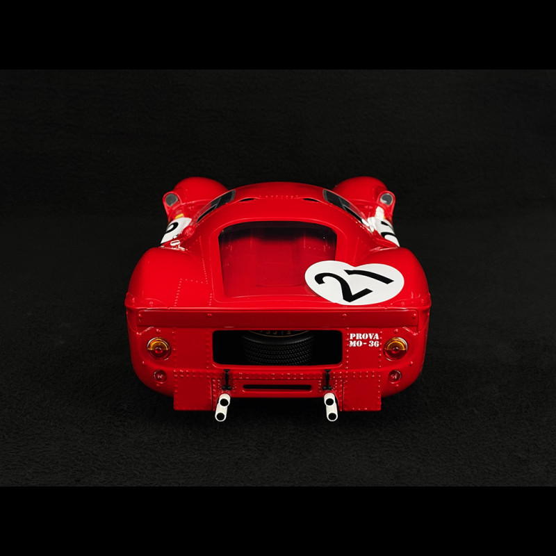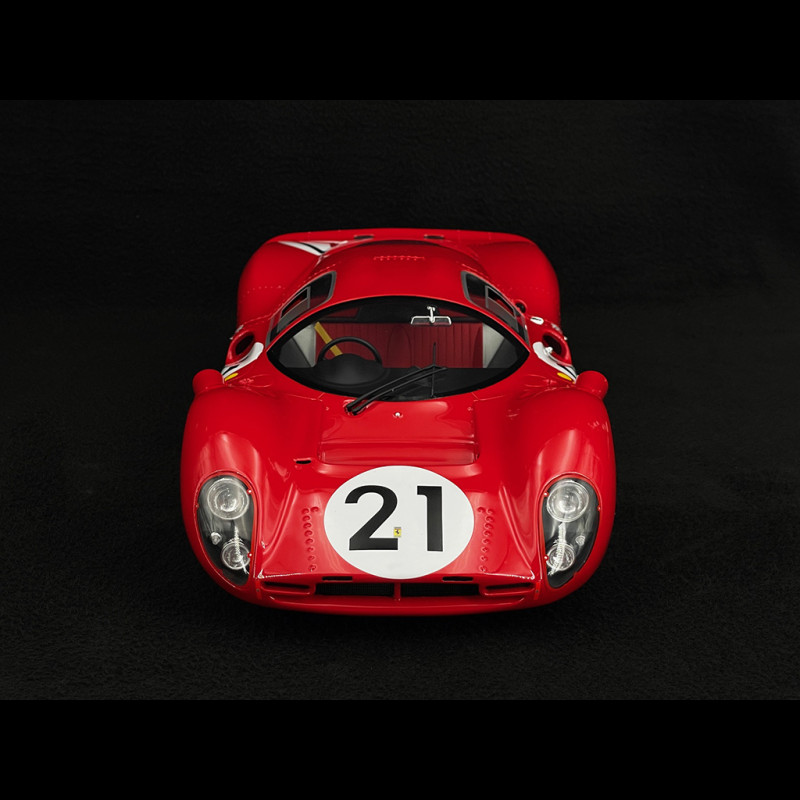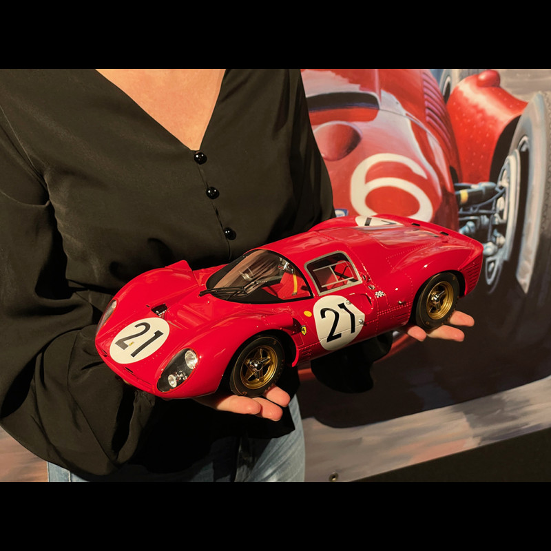 Der Ferrari 330 P4 Nr. 21 ist eines der legendärsten Modelle in der Geschichte des Motorsports. Er wurde 1967 von der Scuderia Ferrari beim 24-Stunden-Rennen von Le Mans eingesetzt und belegte in einem von intensiver Rivalität zwischen den beiden Herstellern geprägten Rennen einen bemerkenswerten zweiten Platz hinter dem Ford GT40. Der von Ludovico Scarfiotti und Mike Parkes gefahrene rote Barquette verkörpert mit seinem fließenden Design italienische Eleganz und Leistungsstärke. Der 330 P4 vereinte Kraft, Zuverlässigkeit und Aerodynamik und trug damit zum prestigeträchtigen Sieg von Ferrari in der Gesamtwertung der Weltmeisterschaft der Hersteller im selben Jahr bei.