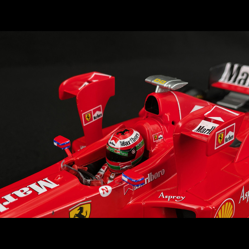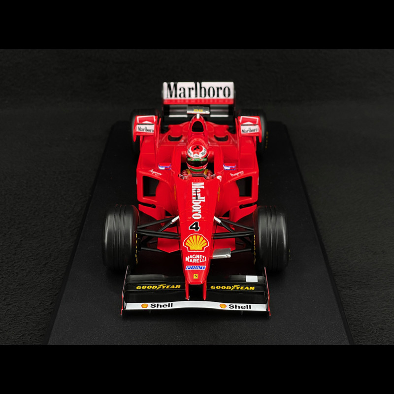 Der Ferrari F300 Nr. 4, den Eddie Irvine beim San Marino GP 1998 (Imola) fuhr, war mit den umstrittenen „Tower Wings“ ausgestattet, einer aerodynamischen Innovation, die von den Seitenkästen aus sichtbar war. Trotz dieses gewagten Designs erreichte Irvine den 3. Platz und sicherte Ferrari damit einen Podiumsplatz gegen starke Konkurrenz. Dieses Modell symbolisiert die technische Experimentierfreude, die Ferrari zu dieser Zeit auszeichnete, und veranschaulicht gleichzeitig die Fähigkeit des Unternehmens, auch unter manchmal gefährlichen Bedingungen wettbewerbsfähig zu bleiben.