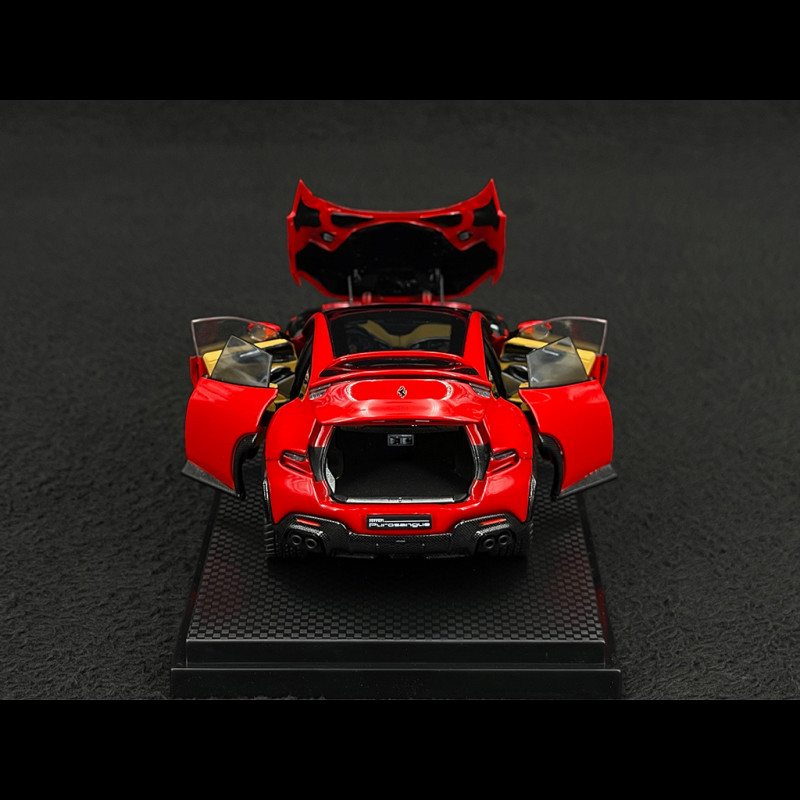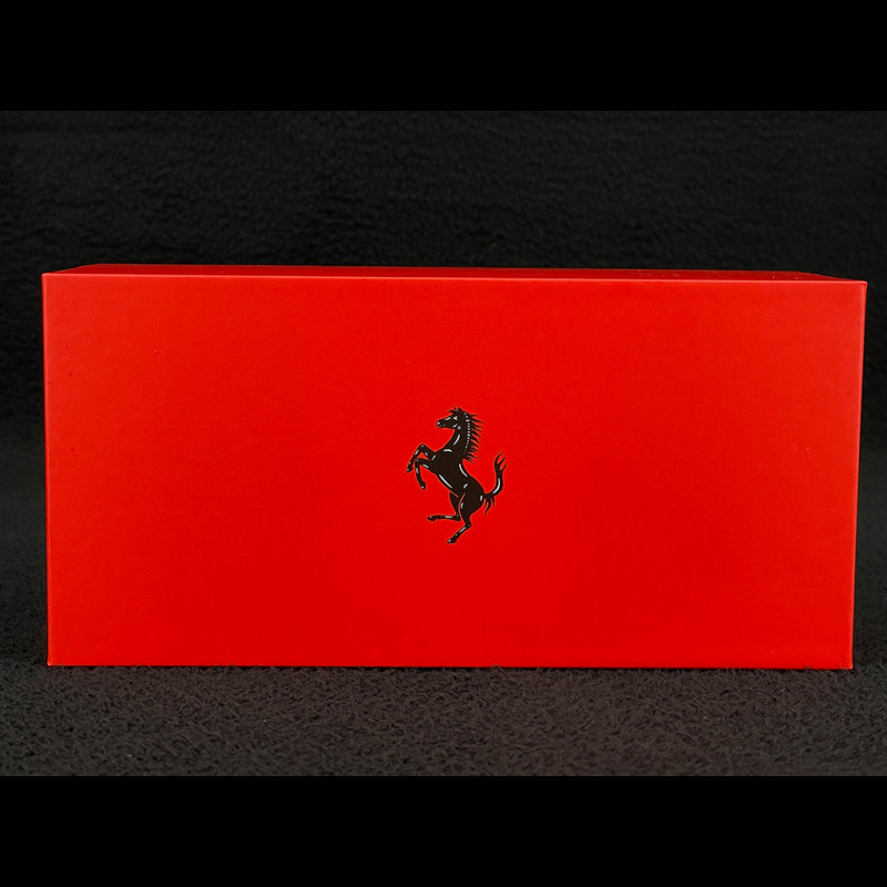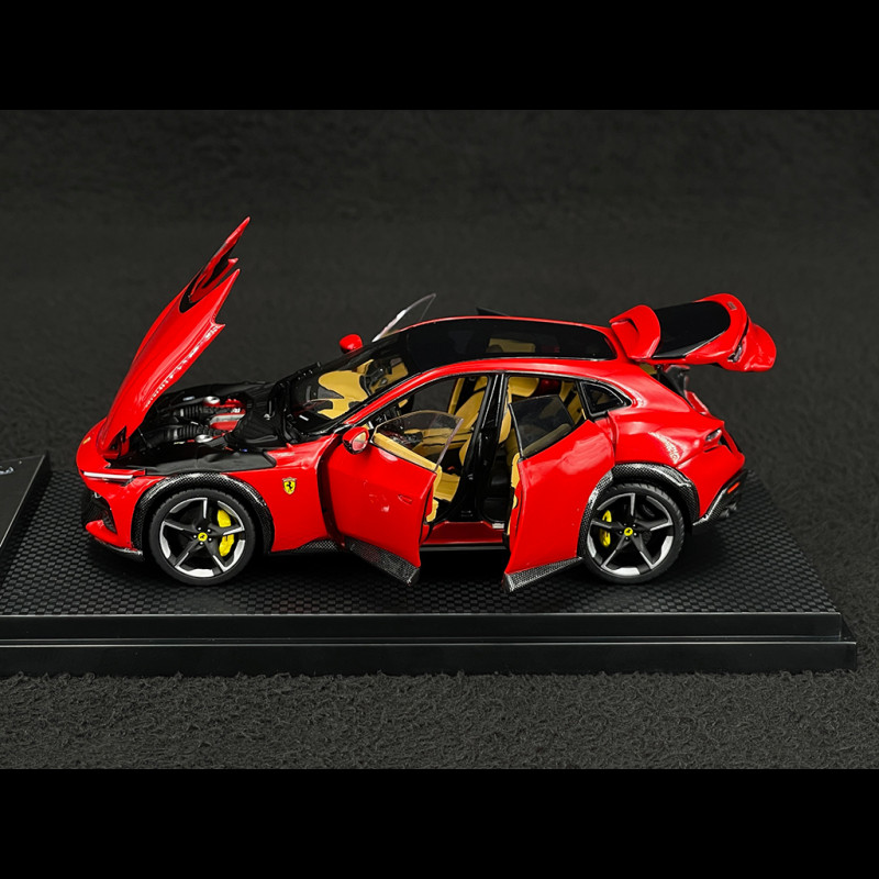 Dieses Miniaturmodell präsentiert Ferraris ersten SUV in einer äußerst sportlichen Konfiguration: eine tiefglänzende Karosserie in Rosso Corsa, straffe Linien und muskulöse Radhäuser, die seine Größe betonen und gleichzeitig der DNA der GT-Fahrzeuge aus Maranello treu bleiben. Das Panoramadach gibt den Blick auf den detaillierten Innenraum frei, während Räder, Scheinwerfer und Stoßfänger fein nachgebildet sind und den Premium-Charakter des Modells unterstreichen. Der aus Metall gefertigte Purosangue im Maßstab 1:43 verfügt über zu öffnende Türen und Motorhaube, die den Blick auf den Innenraum und den Motorraum freigeben – ein echtes Highlight für Sammler. Präsentiert auf einem Sockel in Carbon-Optik mit Vitrine, richtet sich dieses limitierte Modell an moderne Ferrari-Enthusiasten, die ein hochwertiges, detailgetreues und ausstellungsfreundliches Sammlerstück suchen.