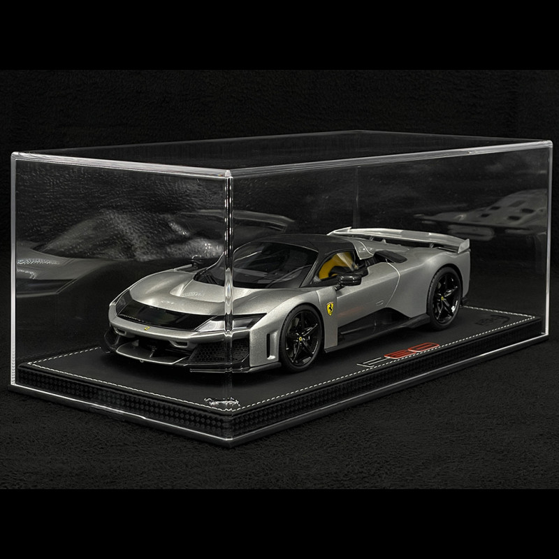 Dieser Ferrari F80 Carbon-Option besticht durch sein glänzendes, aluminiumgraues Finish, das die extrem straffen Linien des Konzeptfahrzeugs mit seiner stark geneigten Frontpartie, den skulpturalen Lufteinlässen und dem vom Prototyp 499P inspirierten, spitz zulaufenden Heck perfekt in Szene setzt. Die Carbonfaser-Felgen, Aerodynamikelemente und Diffusoren sind detailreich gestaltet und bilden einen sportlichen Kontrast zur metallischen Karosserie, wodurch der futuristische Hypercar-Charakter des Modells verstärkt wird. Das aus Resin im Maßstab 1:18 gefertigte F80-Modell bietet trotz seiner geschlossenen Karosserie, die auf einem hochwertigen Sockel montiert ist, eine außergewöhnliche Genauigkeit in Form und Proportionen sowie einen hohen Detailgrad. Konzipiert als „Traumwagen“, der Ferraris extreme Leistung und Hybridtechnologie (1.200 PS im Original) zelebriert, richtet sich dieses Sammlerstück an Kenner exklusiver Modelle und Konzeptfahrzeuge aus Maranello.