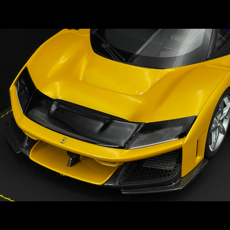 Dieses Ferrari F80 Tristrato Giallo Modell von BBR im Maßstab 1:18 ist eine Resin-Miniatur ohne zu öffnende Teile. Es bildet den Hypercar in der dreischichtigen Lackierung Tristrato Giallo detailgetreu nach, kombiniert mit klassischen, leuchtend silbernen Felgen. Das auf einem Sockel montierte Modell hebt die markanten Linien des F80 (Frontsplitter, Luftauslässe, großer Diffusor, aktiver Heckflügel) und den Kontrast zwischen der gelben Karosserie und den silbernen Felgen hervor. Damit eignet es sich ideal für eine Vitrine mit Ferrari-Hypercars in Sonderfarben und hochwertigen BBR-Modellen.