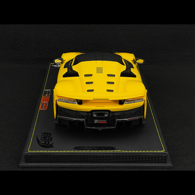 Diese Ferrari F80 Modena Yellow Miniatur von BBR im Maßstab 1:18 ist ein Resinmodell ohne zu öffnende Teile, das mit Sockel geliefert wird. Es bildet den Hypercar in der Farbe Giallo Modena mit klassischen silbernen Felgen detailgetreu nach. Die limitierte Edition hebt die markanten Linien des F80 (aggressive Frontpartie, Lufteinlässe, Diffusor, aktiver Heckflügel) und die Tiefe des dreischichtigen gelben Lacks hervor und ist somit ein ideales Ausstellungsstück für eine Vitrine, die modernen Ferrari-Hypercars und Konfigurationen in der historischen Farbe Modena Yellow gewidmet ist.