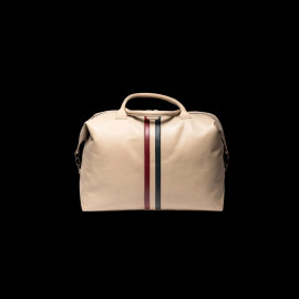Reisen im Retro-Rennsportstil: Diese Tasche aus echtem Leder in Ecru trägt die typischen Merkmale der Steve McQueen Kollektion – vertikale Streifen (Blau, Ecru, Bordeaux), aufgenähter n°20 Patch vorne, 1971 Stickerei auf der Seitentasche, USA-Abzeichen. Zwei große Außentaschen mit Klappen und Reißverschluss. Stilvoll, geräumig und ideal für Wochenendtrips.