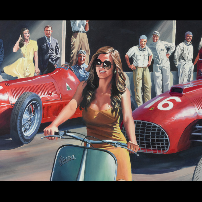 Dies ist eine fiktive Komposition. 1950 tauchte Gina lollobridgida, Muse des italienischen Kinos der fünfziger Jahre, plötzlich mit ihrem Vespa-Roller mitten im Fahrerlager des Grand Prix von Monza auf. Neben ihrem schauspielerischen Talent war sie für ihre wohlgeformten Brüste bekannt und es sind nicht Louis Rosier, Juan Manuel Fangio, Alberto Ascari oder Nino Farina, die dem widersprechen würden! Dieses Gemälde ist auch eine Anthologie, die die großen Piloten der fünfziger Jahre zeigt (Sie können auch Philippe Etancelin, Raymond Sommer, Louis Chiron und Enzo Ferrari sehen) und auch eine Hommage an ihre großartigen Rennwagen. Sie werden verstehen, dass ich ein besonderes Gefühl für den Talbot T26 habe!