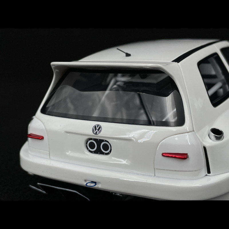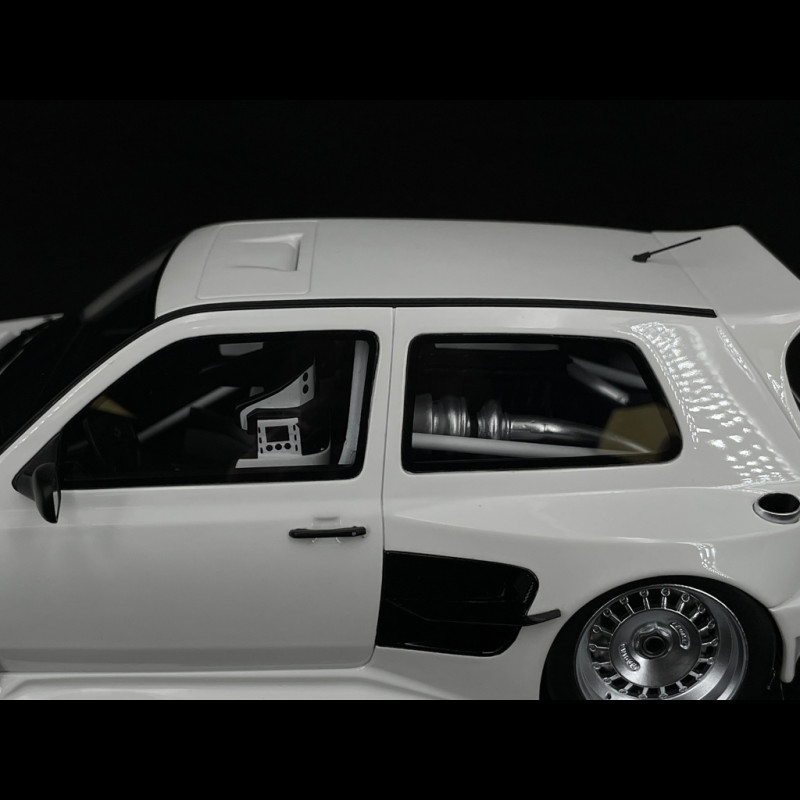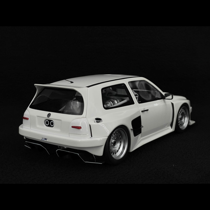 Dieses Volkswagen Golf III Khyzyl Saleem 2024 Miniaturmodell im Maßstab 1:18 ist ein Resinmodell von OttOmobile, das in Zusammenarbeit mit dem Digitaldesigner Khyzyl Saleem entwickelt wurde. Das Fahrzeug basiert auf einem Golf 3, wurde aber komplett neu gestaltet: deutlich verbreiterte Kotflügel, extrem tiefergelegtes Fahrwerk, große, überarbeitete Stoßfänger, massiver Diffusor und Frontsplitter, sehr große Räder mit ausgeprägter Einpresstiefe sowie eine weiße Lackierung mit speziellen Grafiken. Das Ganze ist auf 2000 nummerierte Exemplare limitiert.
