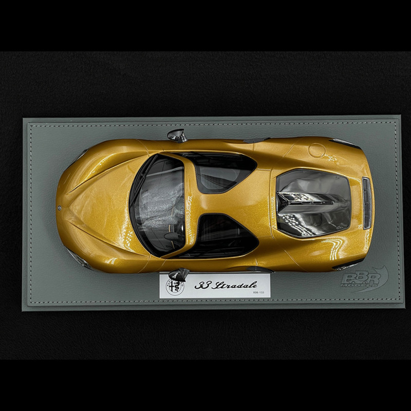 The 1:18 scale Alfa Romeo 33 Stradale miniature, produced by BBR, faithfully reproduces the legendary Italian sports car in Ochre. The iconic lines, elegant bodywork, and mechanical details are meticulously rendered, while the interior reveals all the sophistication of the original model. Presented on a display base, this high-quality resin collector's item is a must-have for Alfa Romeo enthusiasts and collectors of exceptional cars.