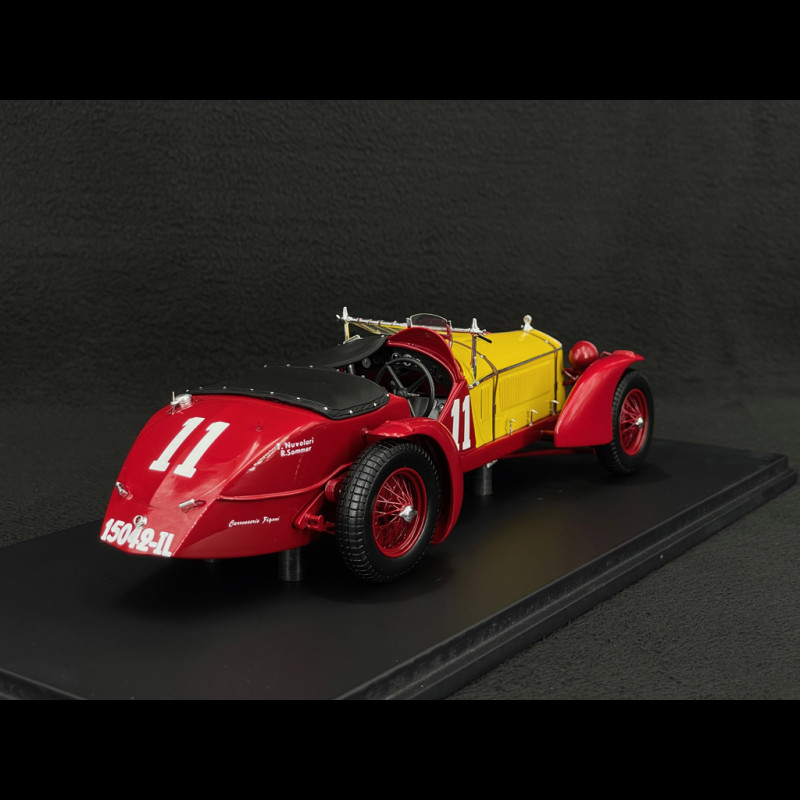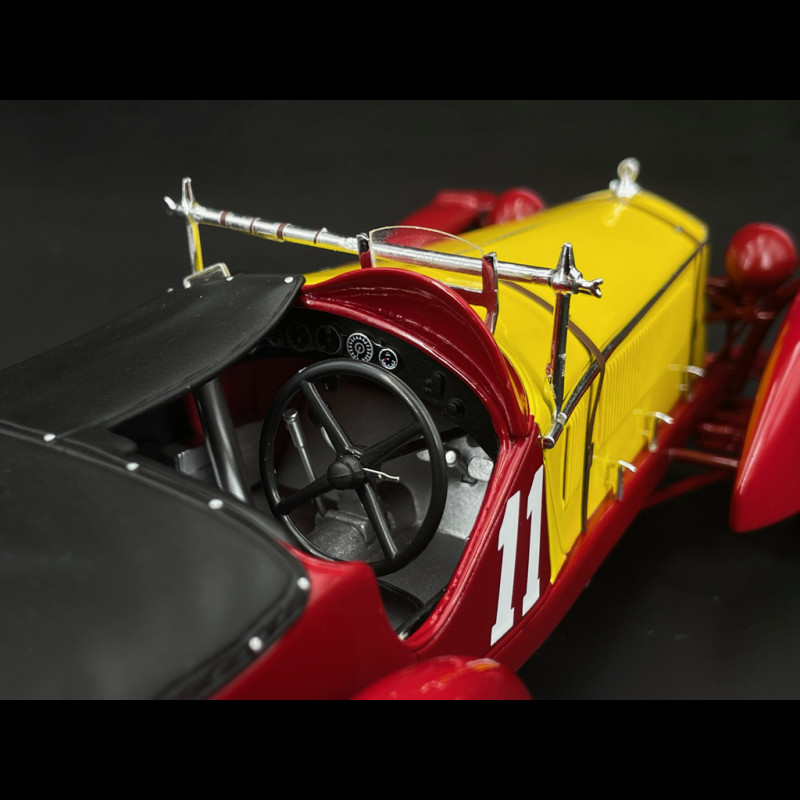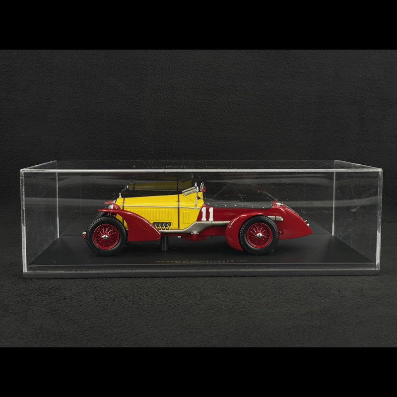 This 1/18 scale resin reproduction pays tribute to the iconic Alfa Romeo 8C 2300 No. 11, winner of the 1933 24 Hours of Le Mans with the legendary Tazio Nuvolari and Raymond Sommer. The historic livery is reproduced with great fidelity, highlighting the elegant lines and characteristic proportions of this pre-war car. The details – headlights, spoked wheels, bonnet straps and cockpit – are finely crafted, offering remarkable realism. Delivered with its display case, this collector's item combines quality finish, historical authenticity and prestige, ideal for endurance racing and classic car enthusiasts.