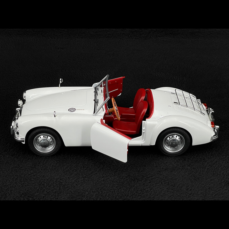 The 1/18 scale model from Triple 9 is an open roadster with a white body, chrome wire wheels, and a burgundy interior. The folded soft top clearly reveals the taut beltline. In the display case, the white exterior/red interior contrast and the wire wheels give a very elegant presence, perfect for a "small British collector's" display alongside a Triumph TR3/TR4 or Austin-Healey.