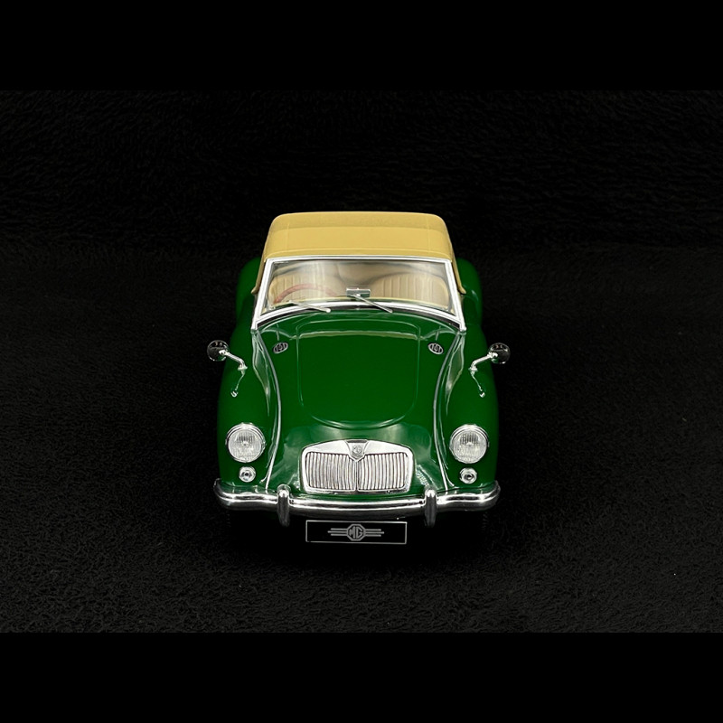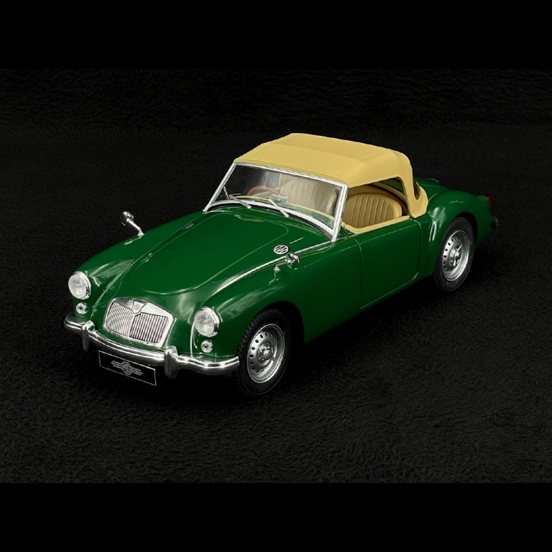 This 1/18 scale model from Triple9 features a green body, a closed soft top, a cream interior, and chrome wire wheels, with right-hand drive and opening doors. In the shop window, this green/cream + soft-top combo gives a very vintage presence, perfect for complementing an MGA series (EX182 Le Mans, hard-top coupe, white Mk2) and composing a small history of the MG lineage on a single tablet.