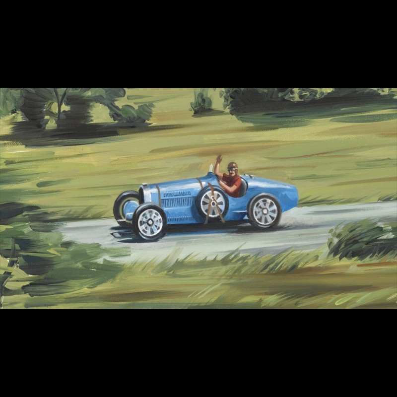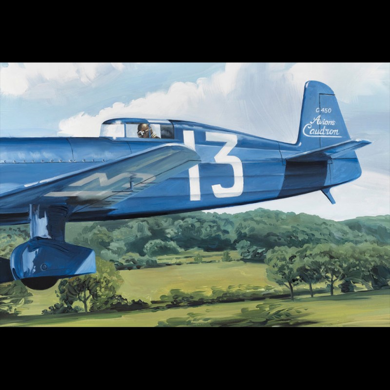 The Deutsch de la Meurthe Cup created in 1909 allowed, as the Schneider Cup, a spectacular technological development of the aviation. The Caudron planes with their extraordinary silhouettes could reach speeds of nearly 400 km/h with a Renault engine of a very relative power for the time (330 CV). We are during the Deutsch Cup of 1934. Here we see Maurice Arnoux, the pilot of the famous Caudron No. 13, overtaking a Bugatti Type 35, whose pilot greets him.