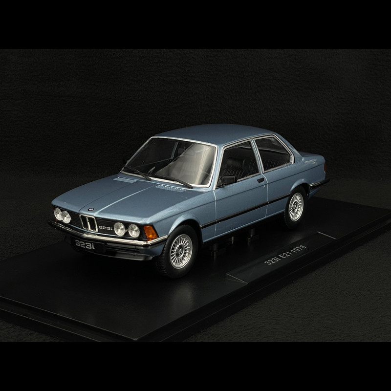 The 1:18 scale BMW 323i E21 1978 model, produced by KK-Scale, is a faithful reproduction of one of the most iconic models from the first generation of the BMW 3 Series. With its elegant light blue livery, this model highlights the classic design of the sporty compact coupe from the 1970s: balanced proportions, taut lines, and the signature double-kidney grille so characteristic of the Bavarian brand.
