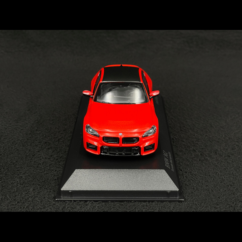 This miniature represents the 2023 BMW M2 G87, an ultra-muscular compact coupe, here in a metallic red that beautifully highlights the flared fenders, the sculpted front bumper, and the muscular rear end. At 1/43 scale, the visual appeal relies primarily on the contrast between the vibrant color, the M aerodynamic elements, and the black details (grille, side skirts, diffuser), making it a dynamic display piece for a modern M collection.