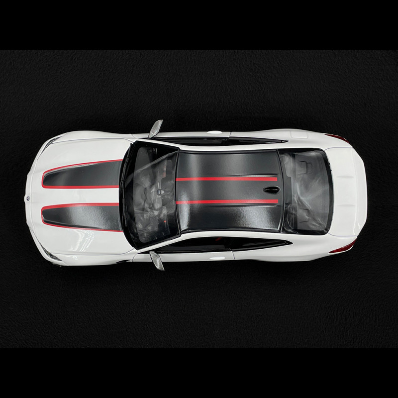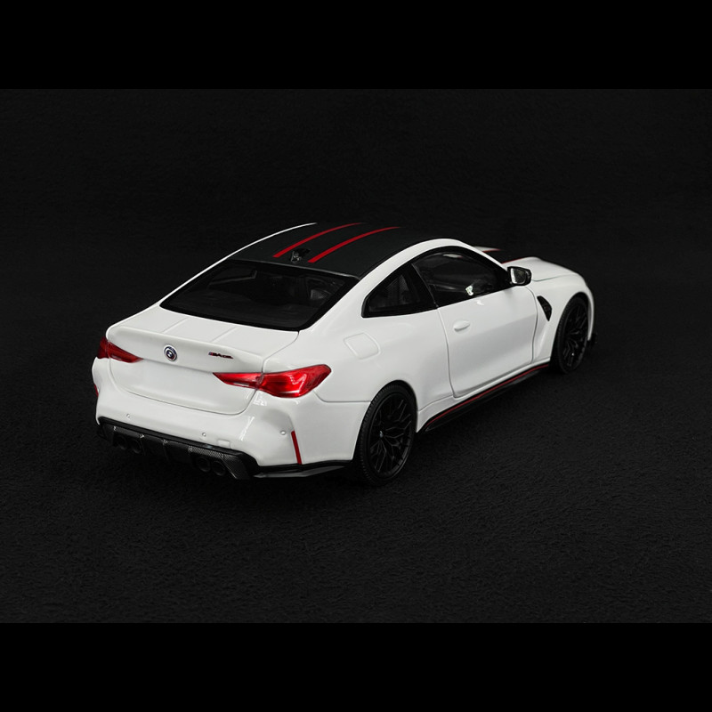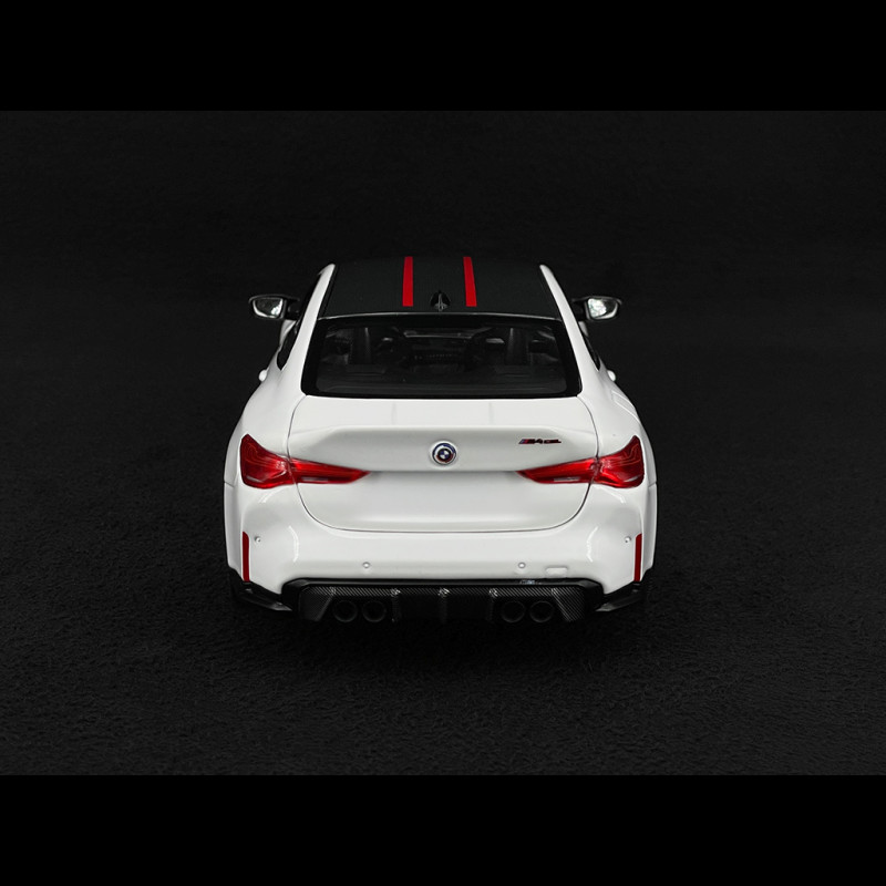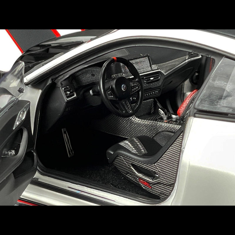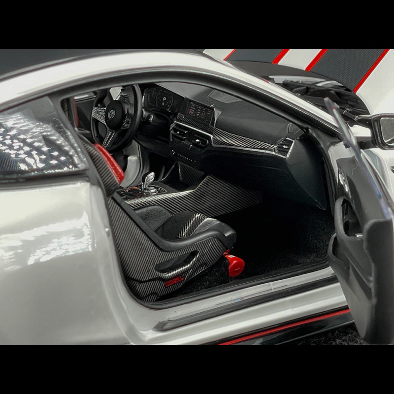 At 1/18 scale, the matte finish gives the bodywork a highly technical look: light glides across the gray without excessive shine, highlighting the wide track, the prominent front lip, and the aggressive diffuser. The sporty rim design, red details (stripes, logos) and the contrast between matte white, glossy black and slim optics give the miniature an ultra-sporty presence, ideal as a centerpiece in a display case dedicated to extreme contemporary BMW M models.