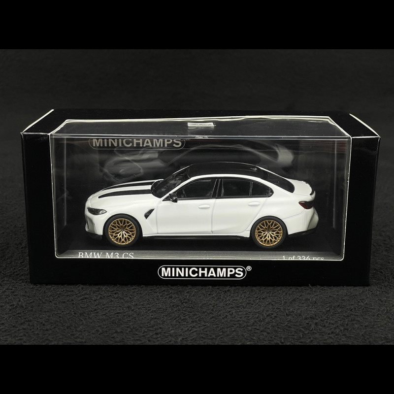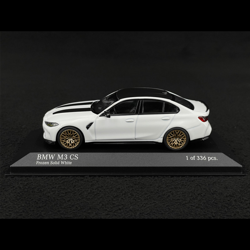 At 1/43 scale, the matte white finish highlights the body's lines and curves: wheel arches, front bumper, and diffuser stand out clearly as soon as the model catches the light. The gold rims, dark details and lack of excessive shine give this little M3 CS a very sporty and modern presence in the showroom, especially alongside the glossy white and metallic grey versions of the same series.