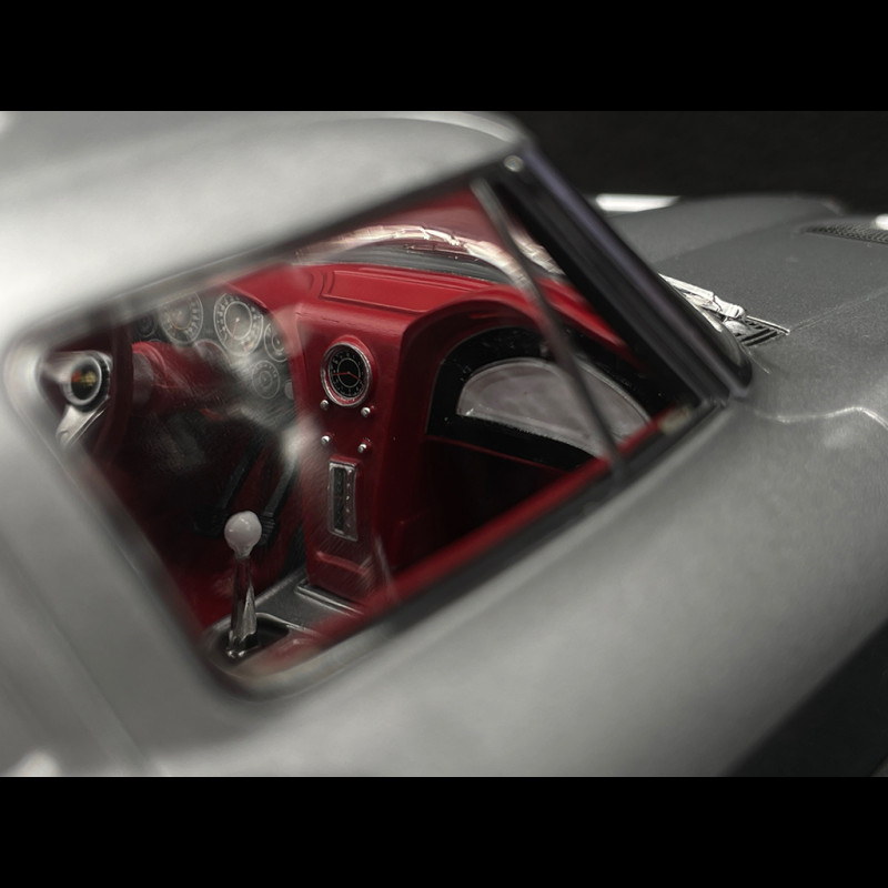 This 1/18 scale 1963 Chevrolet Corvette Stingray Sebring Silver model by Norev is a diecast metal miniature that perfectly captures the Sebring Silver metallic paint, highlighting the taut lines and curves of the C2. The model reproduces the coupe version with its distinctive rear end, a contrasting red interior, and meticulous attention to detail (wheels, chrome, grilles), making it a beautiful addition to a display case dedicated to American muscle cars and sports cars of the 1960s.