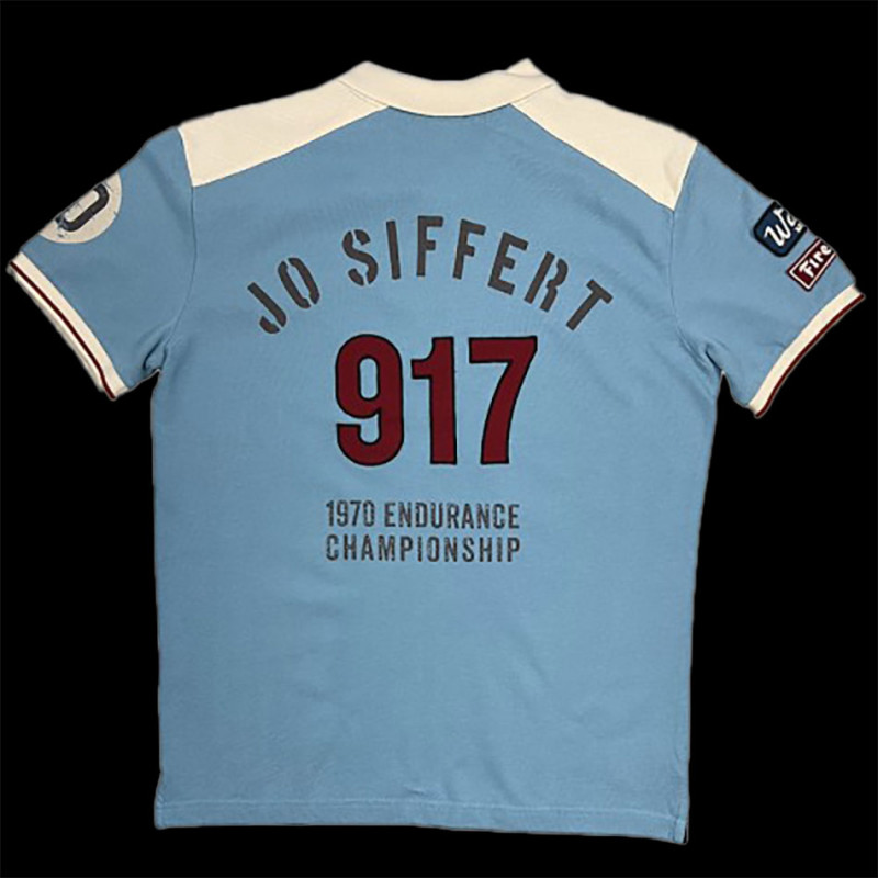 The Warson Motors Jo Siffert 917 Sky Blue polo shirt is a men's 100% cotton polo with a modern cut, quilted shoulders, and red piping on the sleeves for a distinctly vintage racing feel. It prominently displays the Jo Siffert name, markings inspired by the 917 and the 1970 endurance championship, making it a striking piece that is both a historical tribute and easily wearable with jeans or chinos.