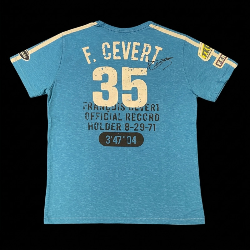 This T-shirt pays tribute to François Cevert, a great French F1 hopeful in the early 1970s, teammate and designated successor to Jackie Stewart at Tyrrell before his death at the 1973 United States Grand Prix. The Cevert Blue shade is close to a bright blue, associated with the French racing colors, a direct nod to his identity as a driver and the aesthetics of the single-seaters of that era.