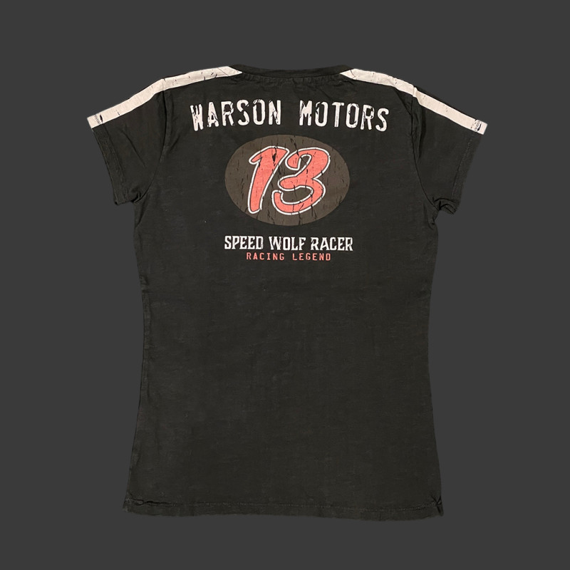 The "Speed ​​Wolf" design is part of the Warson Motors DNA: a stylized wolf presented as "the fastest wolf on earth," a nod to the hot rods, dragsters, and high-performance motorcycles of the post-war era. It evokes a very American imagery, blending biker culture, speed racing, and the rebellious spirit of the drivers and tuners of that time. The Speed ​​Wolf Carbon T-shirt is a women's 100% cotton t-shirt in carbon black, with a comfortable fitted cut and a large Speed ​​Wolf graphic on the chest (wolf's head, racing typography, and Warson references). True to the brand's vintage style, it features a slightly distressed/cracked print effect and pairs easily with jeans or a leather jacket for a look inspired by night runs and the custom bike scene.