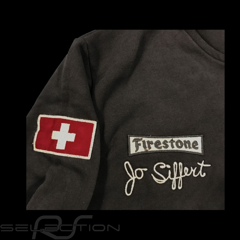 The Siffert Targa Carbon hoodie is a 100% cotton, 100% carbon black hoodie with a comfortable fit, featuring Jo Siffert's signature and Targa branding (including Firestone, Heuer Chronograph, "King of Speed," etc.) on the chest and back. It features a drawstring hood, a zip closure and two front pockets, for a warm and easy-to-wear vintage racing hoodie, perfect in combination with jeans and sneakers at a meeting or for everyday wear.