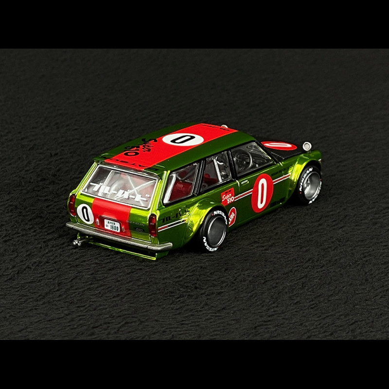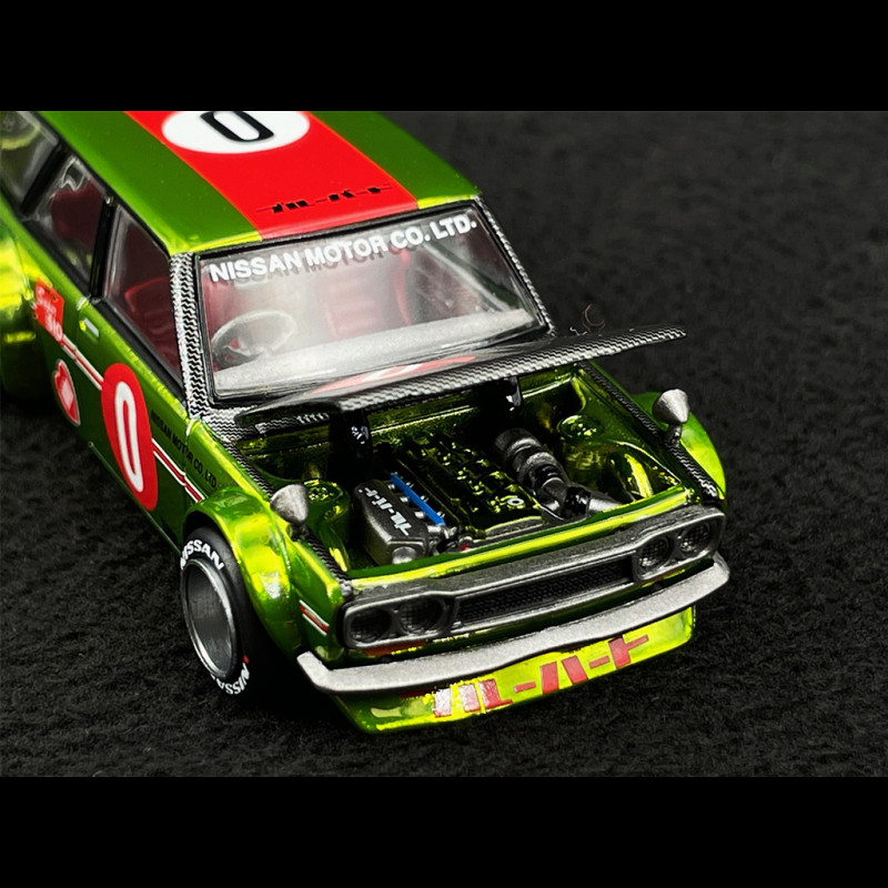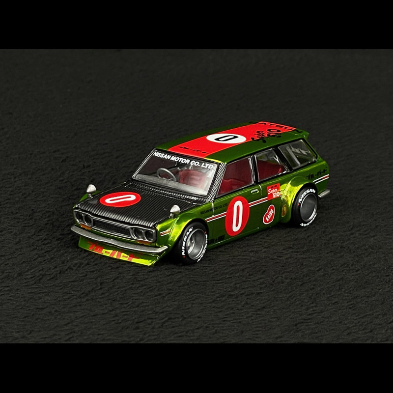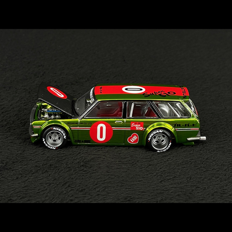 The 1969 Datsun 510 Wagon “Kaido OG Flo Yellow” is the result of a collaboration between Mini GT and Kaido House. It features a vibrant chrome OG Flo Yellow paint job, a body-wide kit, an opening grille that reveals a detailed engine, as well as the flared arches and lowered stance typical of Kaido builds. This model is a must-have for JDM culture and limited parts enthusiasts.