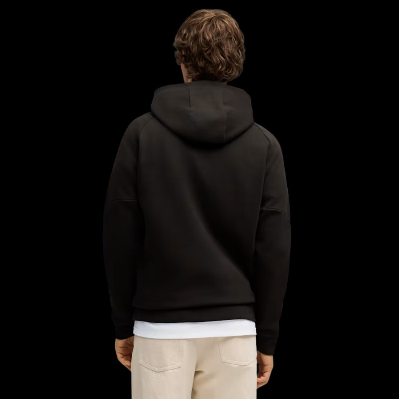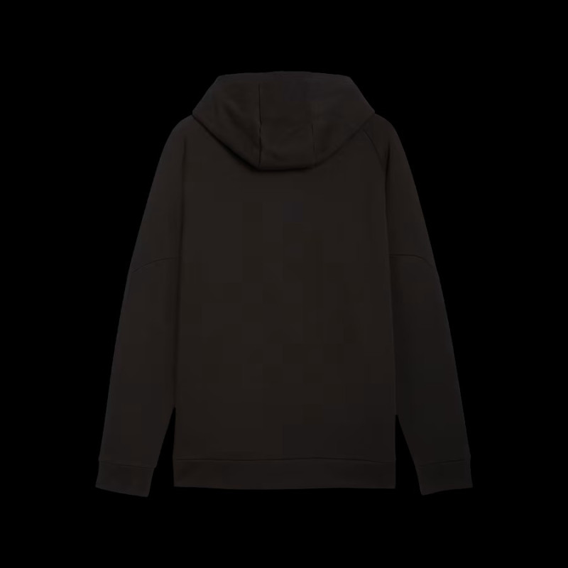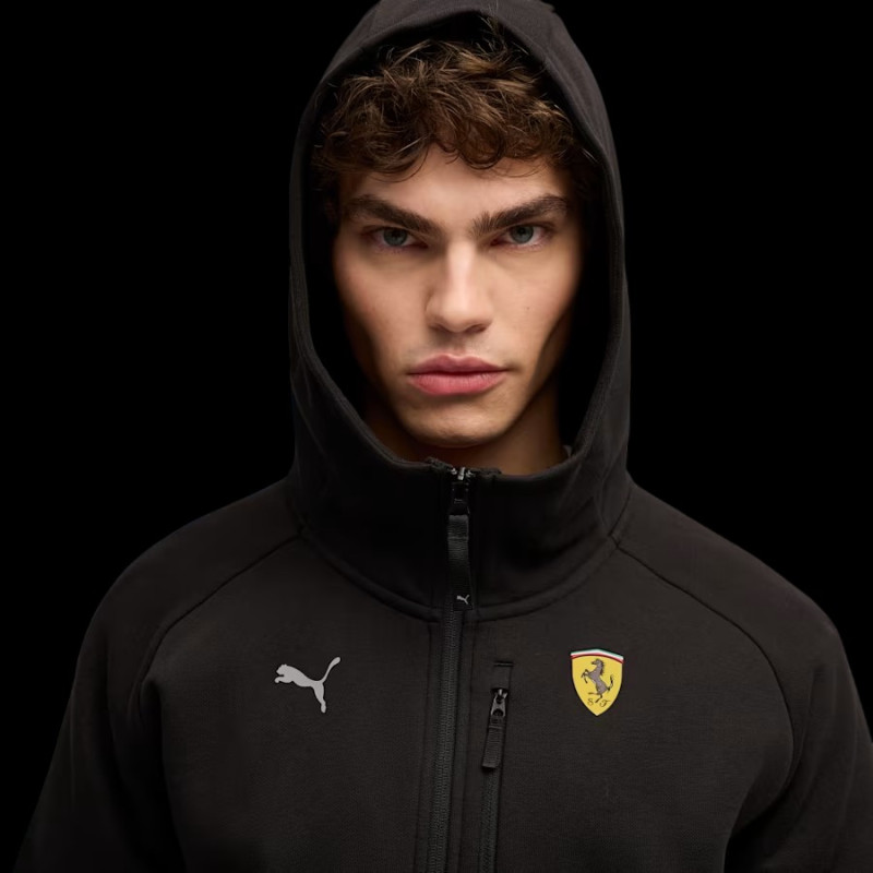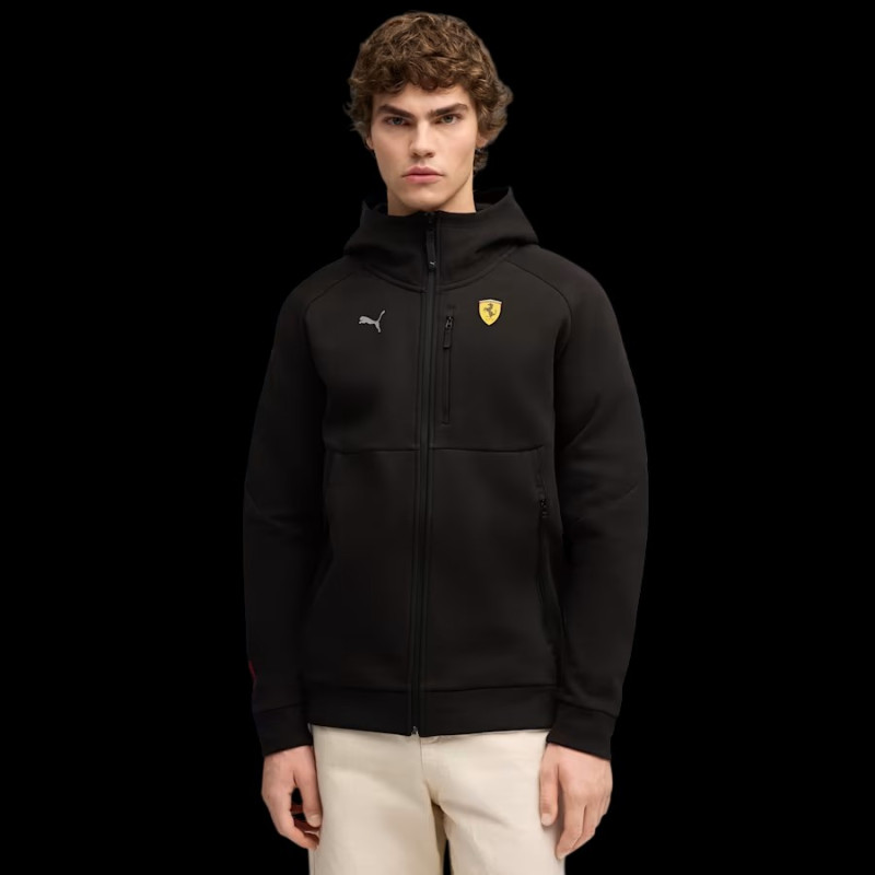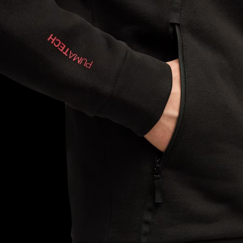 This black zip hoodie by Puma blends comfort and F1 heritage. With Scuderia Ferrari and Puma logos, fixed hood, zipped pockets, and bold red "PUMATECH" sleeve branding.