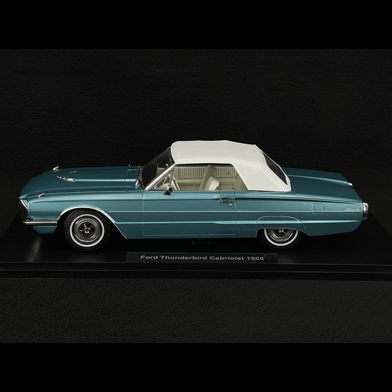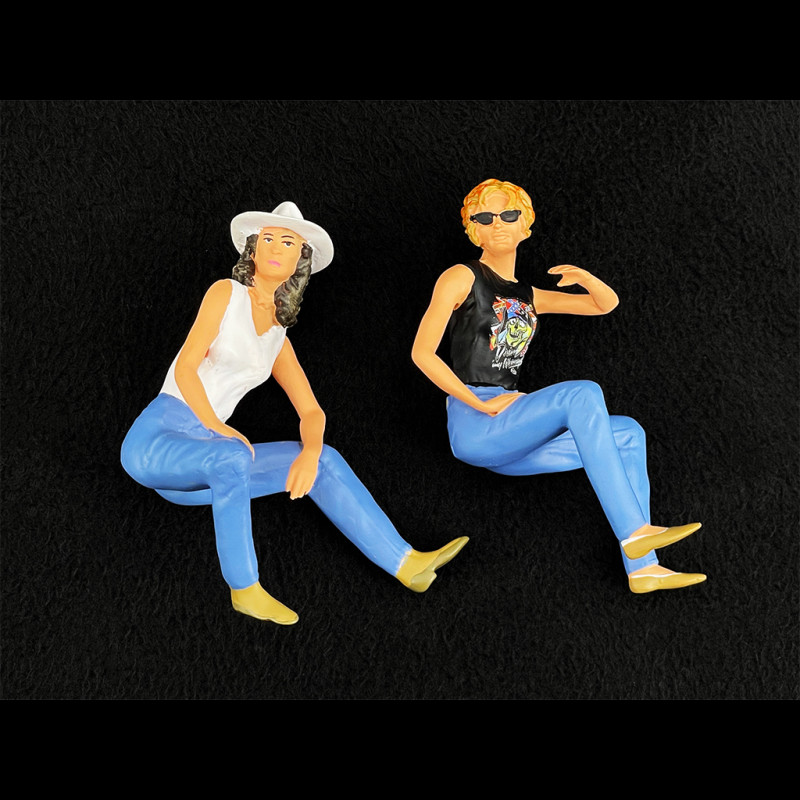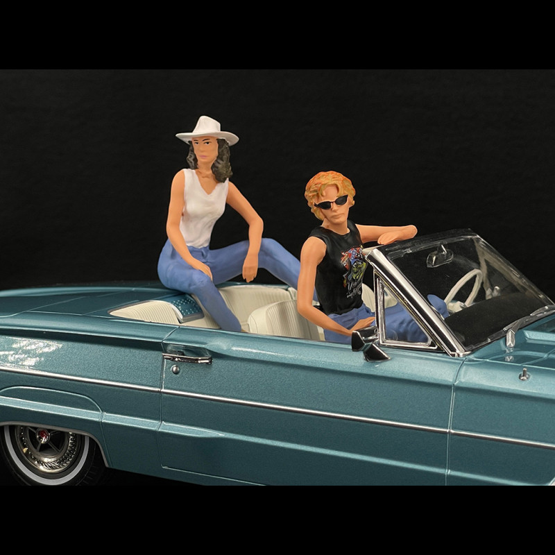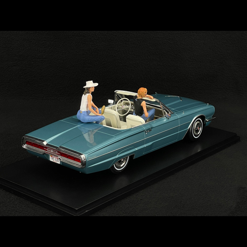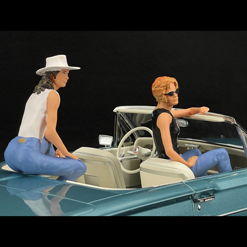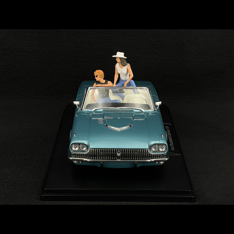 The 1/18 scale Thelma and Louise figures are made of resin and depict the two heroines in poses reminiscent of movie characters, designed to be displayed alongside the 1966 Ford Thunderbird Convertible rather than on their own. The way the figures are rendered, their clothing, and their poses make them ideal for depicting a famous scene from the 1991 film. As for the 1/18 scale 1966 Ford Thunderbird Convertible, in light metallic blue with a white roof, it faithfully reproduces the car that became a symbol of freedom and escape in the film, with its long lines, pronounced fenders, and typically "full-size" American look. Combining this Thunderbird with the figure set allows you to create a very cinematic narrative diorama: the two heroines ready to go, posed in their convertible, for a frozen Thelma & Louise scene right on your shelves.
