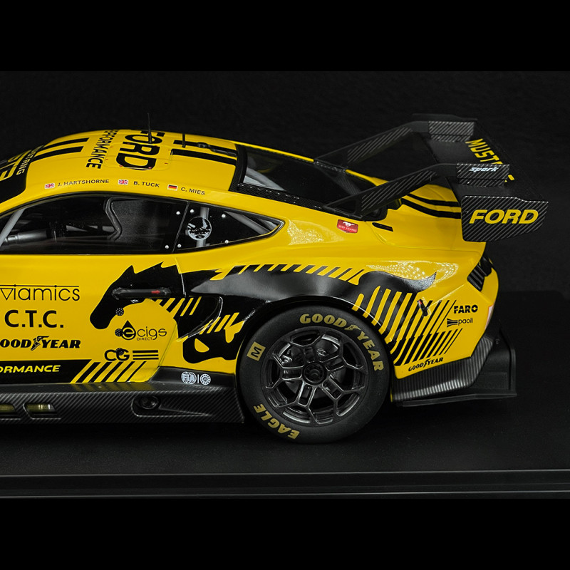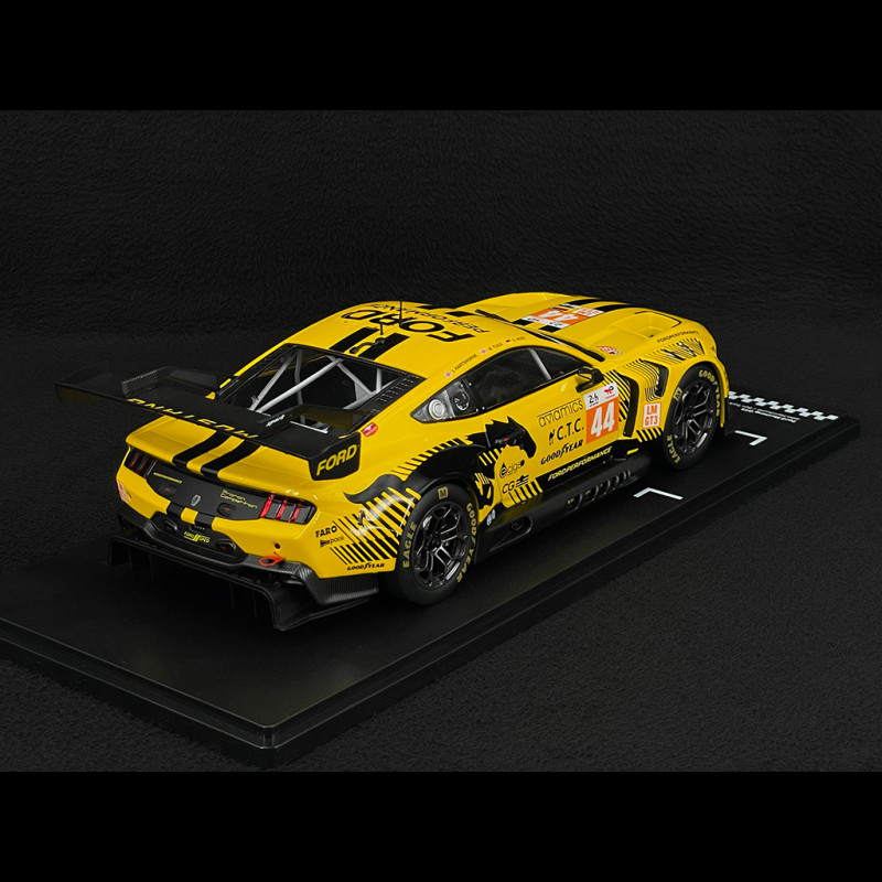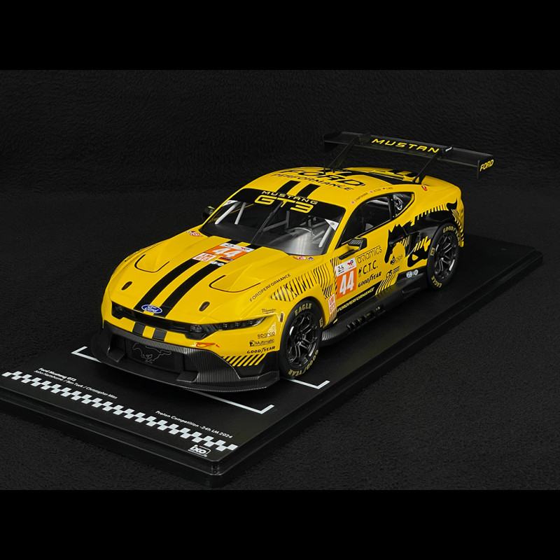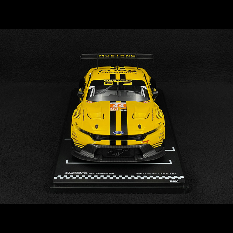 The 1/18 scale Ford Mustang GT3 #44 24h Le Mans 2024 model faithfully reproduces the Proton Competition car with its yellow and black livery, aggressive aerodynamic kit, and distinctive wide Mustang GT3 grille. It features the number 44, the Hartshorne/Tuck/Mies names on the interior, racing wheels, and finely molded resin body details, making it an ideal piece for a display case dedicated to modern LMGT3s and Ford's return to Le Mans.