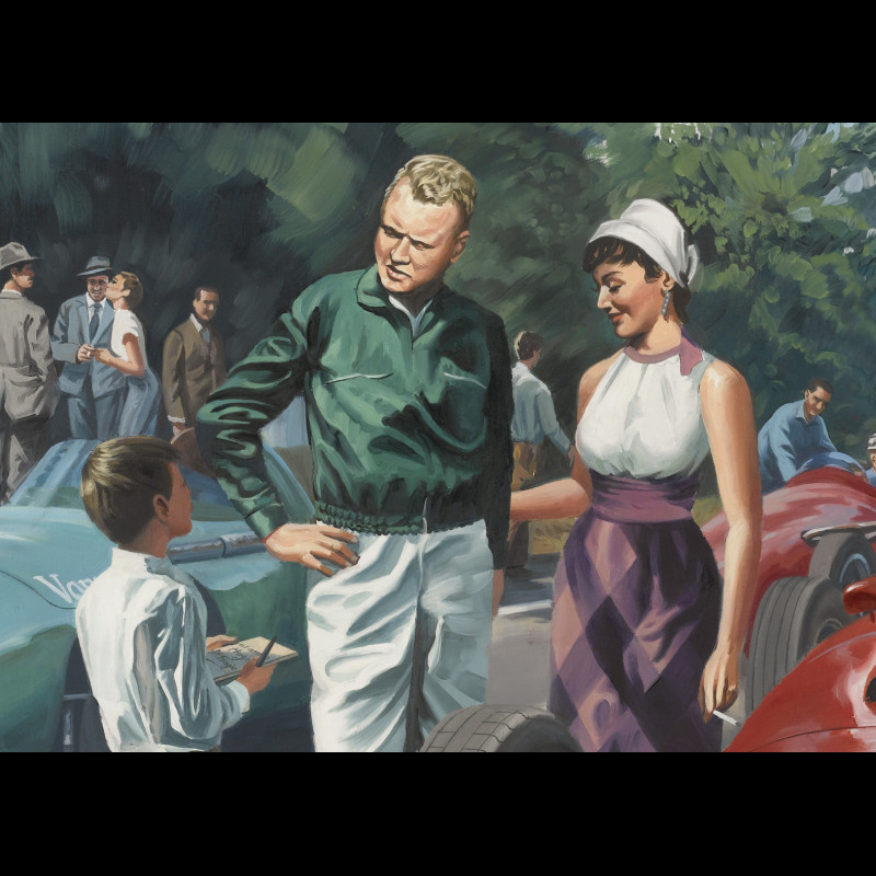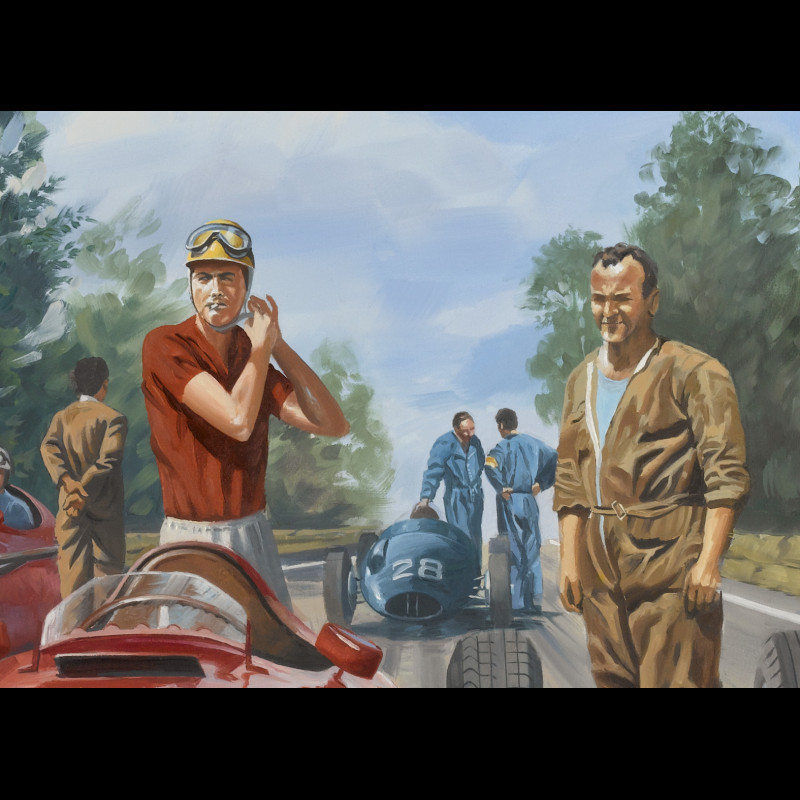 You are in 1957 at the Rouen les Essarts Grand Prix. In the foreground you can see a little boy asking for an autograph from Mike Hawthorn and, further to the right, a small group of pllotes made up of Peter Collins, Eugenio Castelotti, Juan Manuel Fangio. In the crowd on the left, some famous people - among them Jacques Tati, Jean-Paul Belmondo, Jean Seberg and even the author himself, are enjoying this beautiful day in Essarts...
