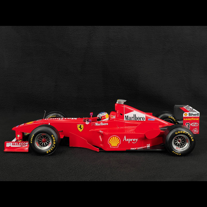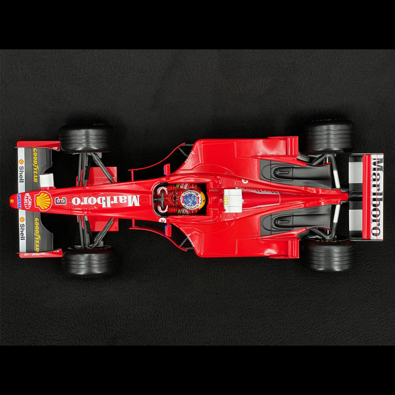 The carbon fiber chassis and aerodynamics are optimized for high-speed circuits: a low-loaded rear wing, a slimmer front wing, and compact sidepods, all designed to reduce drag while maintaining stability. The Ferrari red livery, the logos of the sponsors of the time, and Schumacher's number 3 complete the picture of this iconic F1 car. The interior is minimalist and purely functional: a narrow cockpit, a multifunction steering wheel, harnesses, and a molded seat, all designed to serve the driver.