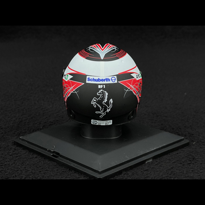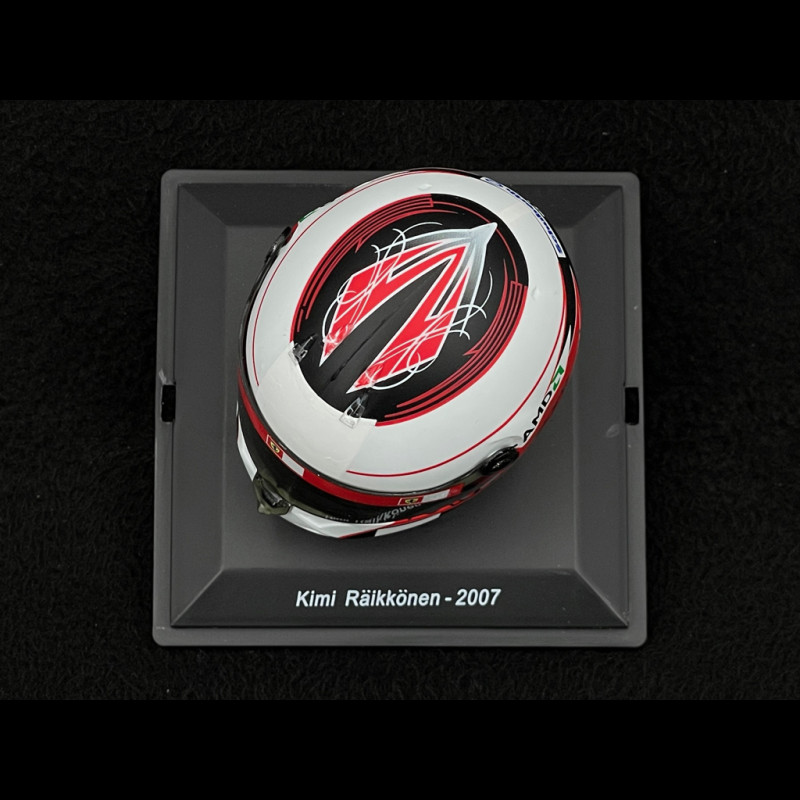 This helmet replicates the design worn by Kimi Räikkönen during his championship-winning season with Ferrari in 2007, featuring a white base accented with large red areas and signature tribal patterns, matching the F2007 colors. The Ferrari and sponsor logos are finely printed, while the shape of the shell and visor create a realistic look that fits perfectly into a collection dedicated to the Scuderia or the Finnish driver.