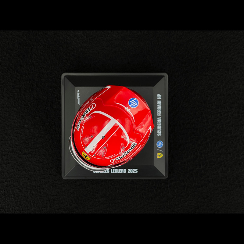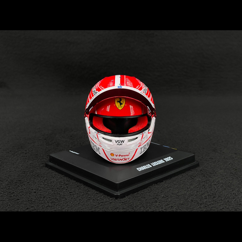 This helmet features the classic Ferrari red base combined with white accents, with a dynamic graphic design centered around the number 16 and the Scuderia Ferrari HP logo. The angular lines, gradient effects, and partner logos structure the helmet like a true design object, perfectly matching the SF25 2025 livery. At 1/5 scale, the glossy finish highlights the color contrasts: red, white, yellow, and black interact around the smoked visor and the upper band. The branded base, the plexiglass hood, and the fine markings give this miniature a premium presence, ideal for displaying alongside a 1/18 or 1/43 scale SF25 model in a Leclerc display case dedicated to the 2025 season.