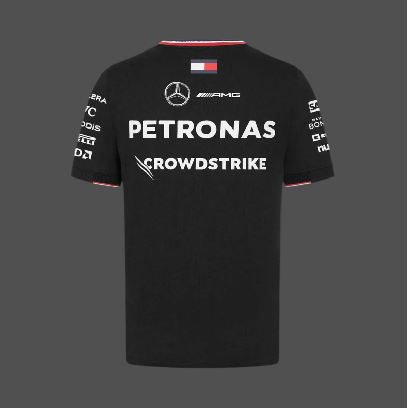 Sporty, stylish and packed with team pride: this Mercedes T-shirt features printed sponsor logos, a tricolour collar and Tommy Hilfiger flag at the back. A premium piece that combines racing DNA with timeless fashion appeal.