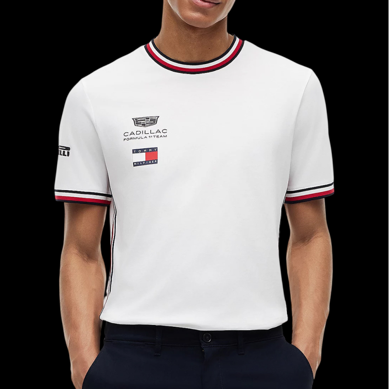 This pure cotton T-shirt is the replica version of the team's "set-up" top: crew neck, thin signature trim on the collar and sleeves, branded stripe on the sides, Cadillac F1 and Tommy Hilfiger logos on the chest and back, plus the Pirelli logo on the sleeve. In a regular fit and made of 100% cotton, it offers a clean and technical look, ideal for showing your Cadillac F1 colors at Grand Prix races or in a streetwear style.