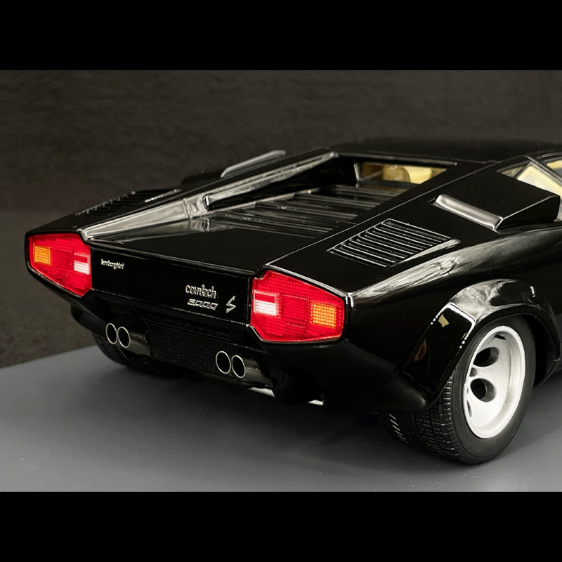This 1/18 scale model represents the iconic Lamborghini Countach 5000 S as it appeared in 1985. The angular design, rear wing, and signature wedge shape are all faithfully reproduced in this elegant black version.