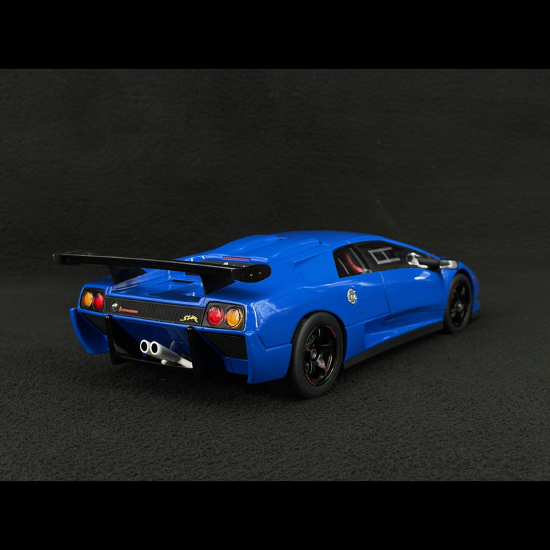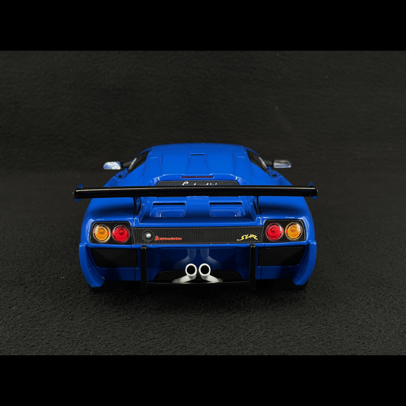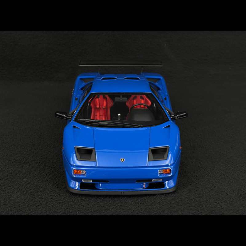 This 1/18 scale blue Lamborghini Diablo SVR by Kyosho replicates the racing version with its aggressive body kit, enormous rear wing, competition wheels, and Diablo Trophy-specific markings, all in a blue livery that strongly accentuates the car's taut lines. Made of resin with a very high level of detail (air intakes, racing interior, roll cage, bucket seat, harness, and visible mechanical components), this miniature is ideal for a display case focused on 90s GT cars, extreme V12 supercars, and iconic one-make trophy cars.
