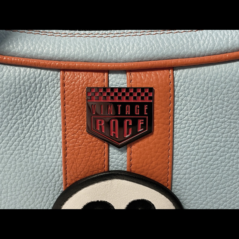 Discover the perfect embodiment of Italian style and craftsmanship with this exquisite, high-end handbag that strikes the perfect balance between iconic style, traditional Italian craftsmanship, and modern functionality—a must-have accessory for those who want to combine elegance and practicality in their everyday lives. Featuring light blue handles and an adjustable, detachable shoulder strap with two central orange stripes, it draws inspiration from the film "Le Mans" (1971), where driver Michael Delaney, portrayed by Steve McQueen, drives a Porsche 917KH bearing the number 20.