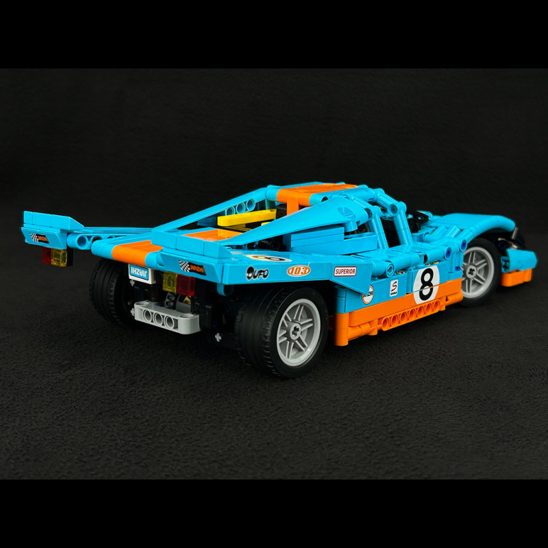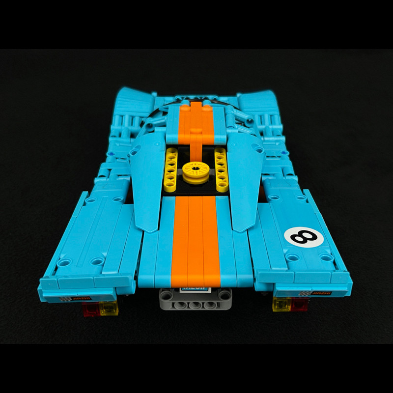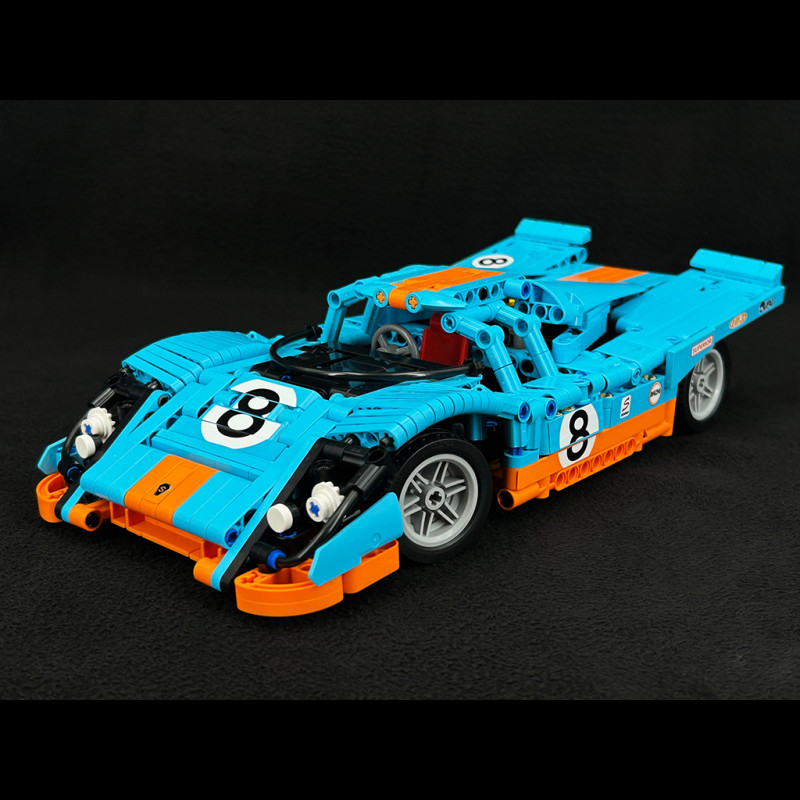 This brick-built Inspired 917 race car set features an aggressive look, with a low-slung body, angular lines, and a wide rear wing that emphasize its sporty character. Both the interior and exterior are detailed, with a structured cockpit, opening hood, and doors, making it a fun and stylish display piece.