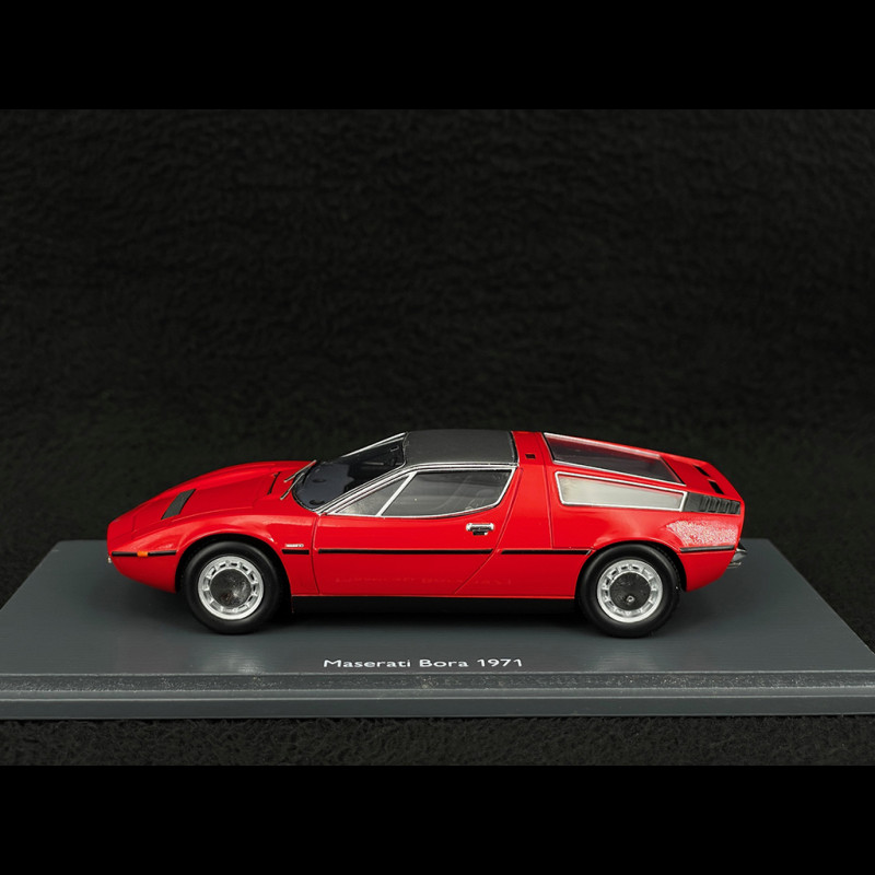 The 1:43 scale miniature of the 1971 Maserati Bora in red, produced by Schuco, is an elegant reproduction of the classic Italian grand tourer from the 1970s. Faithful to the flowing lines and distinctive styling of the original Bora, this model highlights the balanced proportions, chrome details, and deep red livery, reflecting the refined sporty aesthetic of the real car.