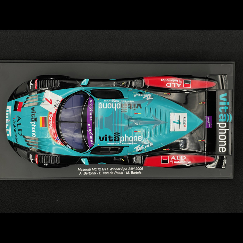 This 1/18 scale resin replica pays tribute to the Maserati MC12 GT1 No. 1, winner of the 2006 24 Hours of Spa with drivers Andrea Bertolini, Eric van de Poele and Michael Bartels. The official livery and Martini Racing markings are faithfully reproduced, highlighting the aerodynamic lines and iconic design of the GT1. The details – headlights, rims, spoilers and cockpit – are finely crafted to offer striking realism. Delivered with its display case, this collector's item combines quality finish, historical authenticity and prestige, ideal for endurance racing and Maserati competition enthusiasts.