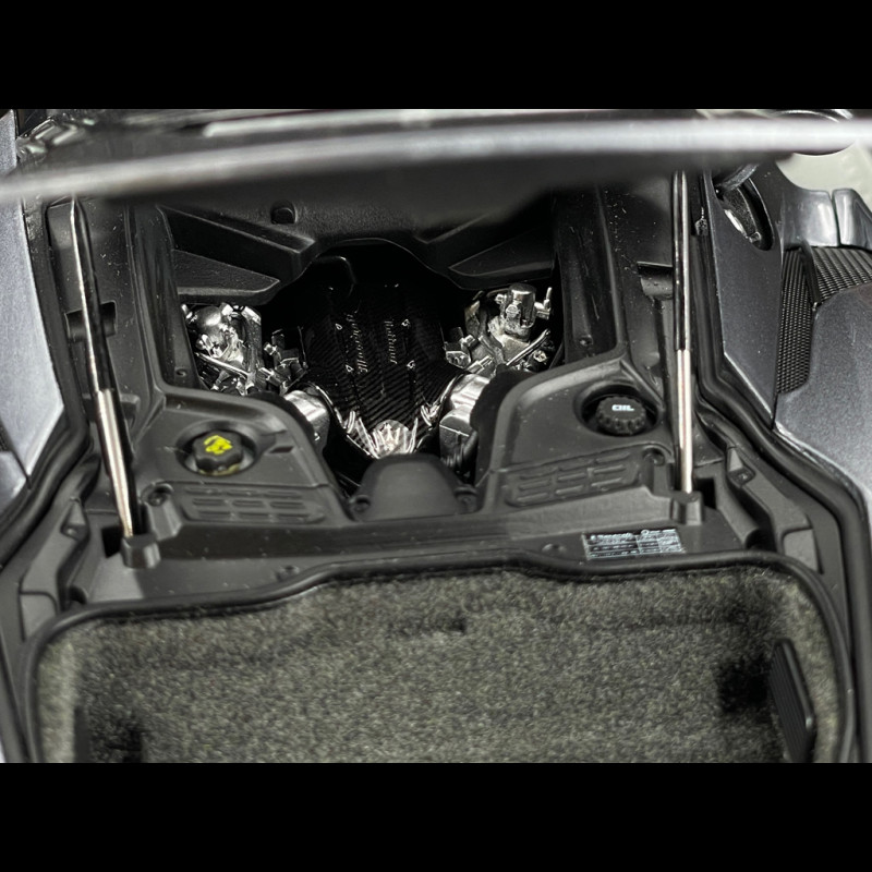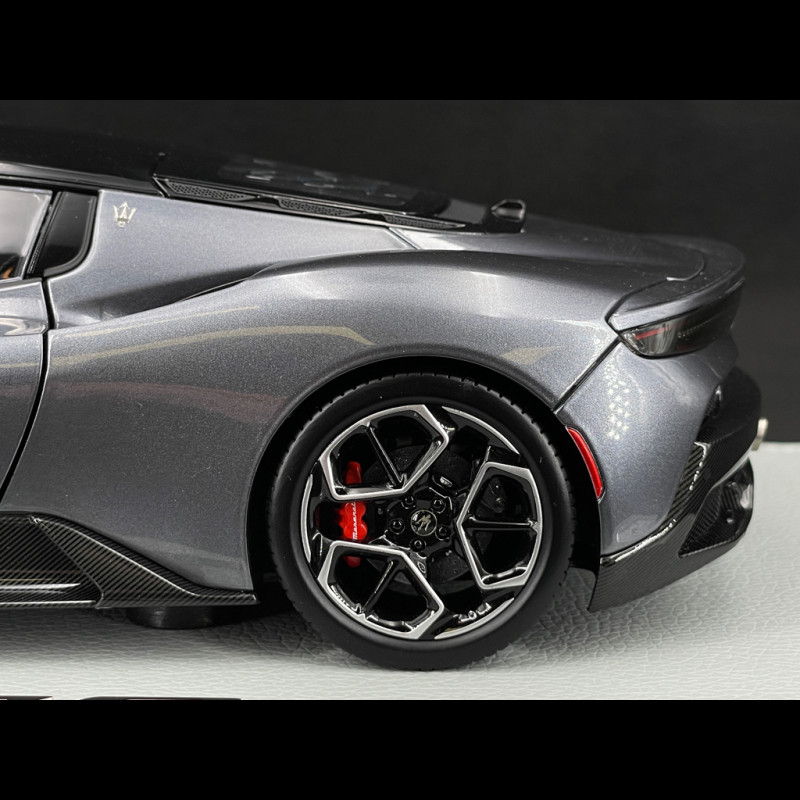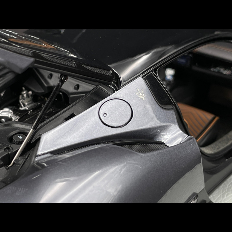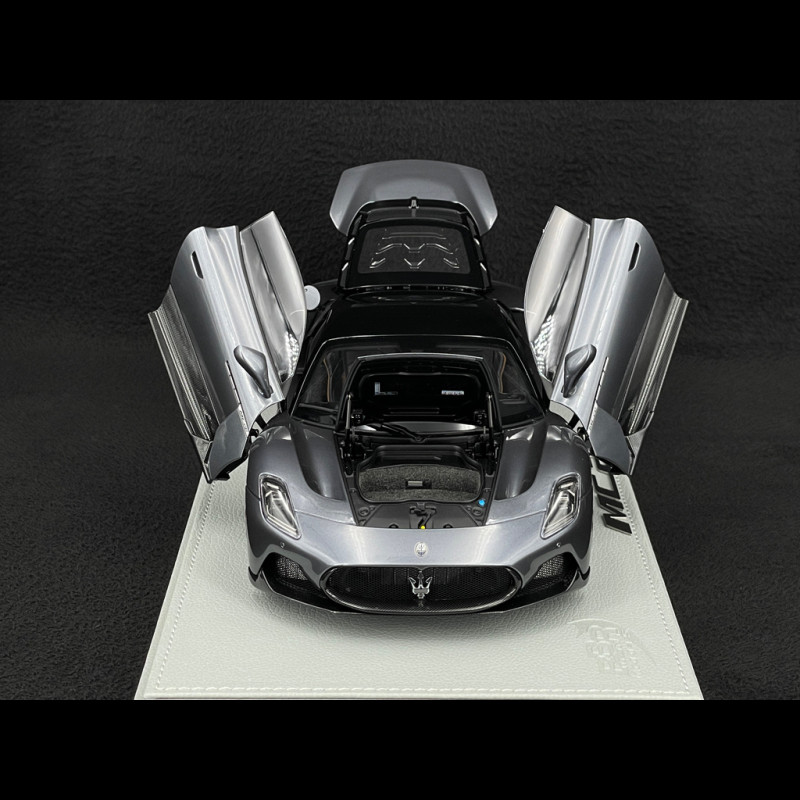 The 1/18 scale Maserati MC20 Grigio Mister is die-cast and features numerous opening parts, allowing for an extremely precise rendering of its contours, bodywork, and aerodynamic elements. The Grigio Mister paint with a Gloss Black roof is applied with a premium finish that accentuates the supercar's curves, while the wheels, brake calipers, headlights, and Maserati logos are meticulously reproduced to maintain the contemporary look of the real car. The model is presented on a stylish display stand, designed for exhibition and to seamlessly integrate into a collection dedicated to Italian GT cars.