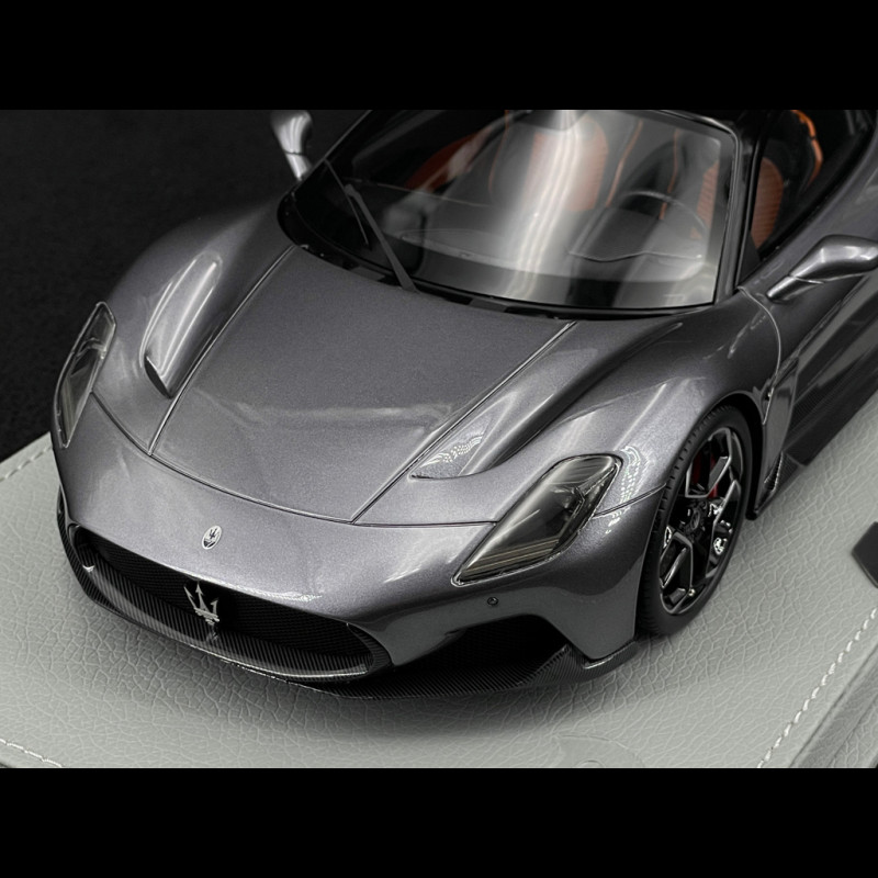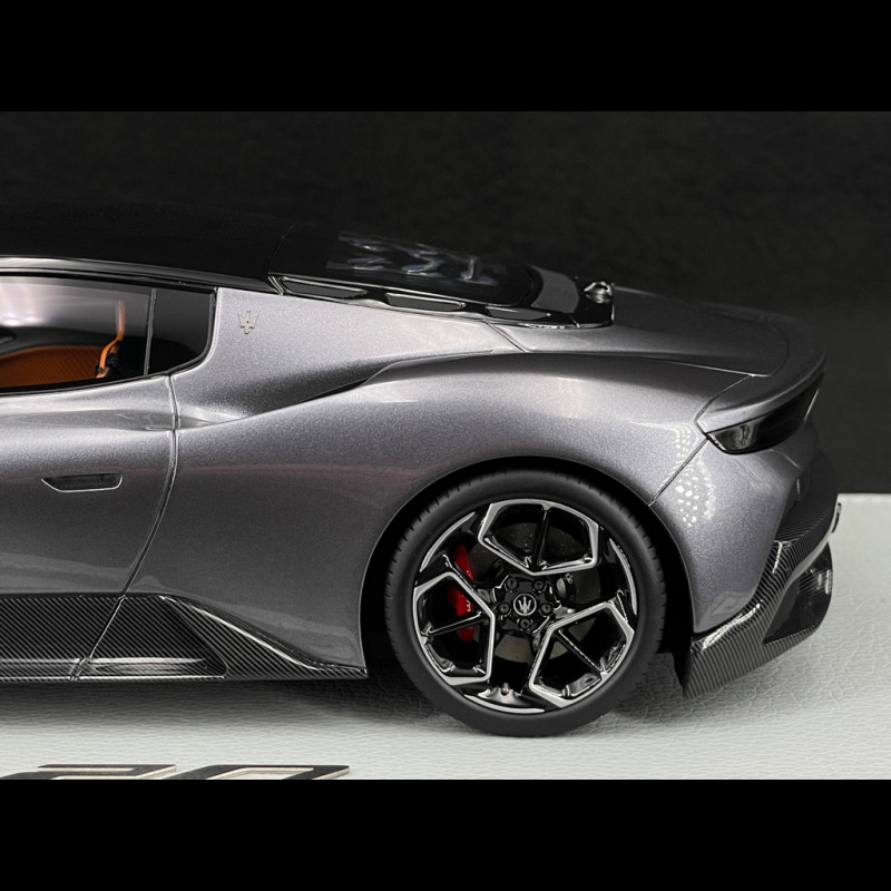 The 1/18 scale Maserati MC20 Grigio Mistero is crafted from high-quality resin, with no opening parts, allowing for an extremely precise rendering of the car's dimensions, bodywork details, and aerodynamic elements. The Grigio Mistero paintwork with a Gloss Black roof is applied with a premium finish that accentuates the supercar's curves, while the wheels, brake calipers, headlights, and Maserati logos are meticulously reproduced to maintain the contemporary look of the real car. The model is presented on an elegant stand and comes with a premium display case, designed for exhibition and to seamlessly integrate into a collection dedicated to Italian GT cars.