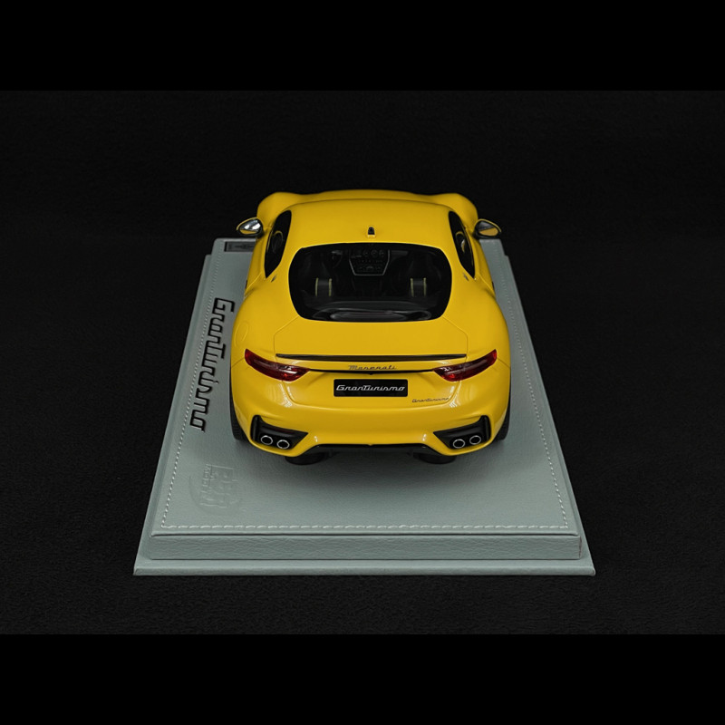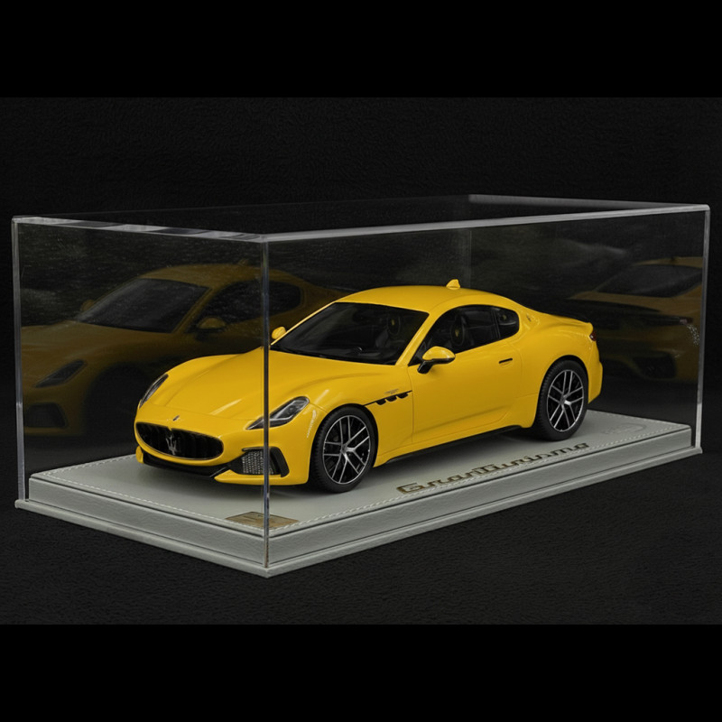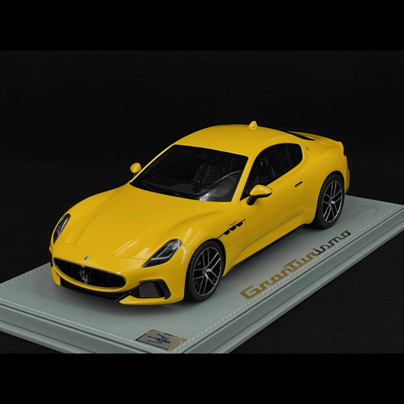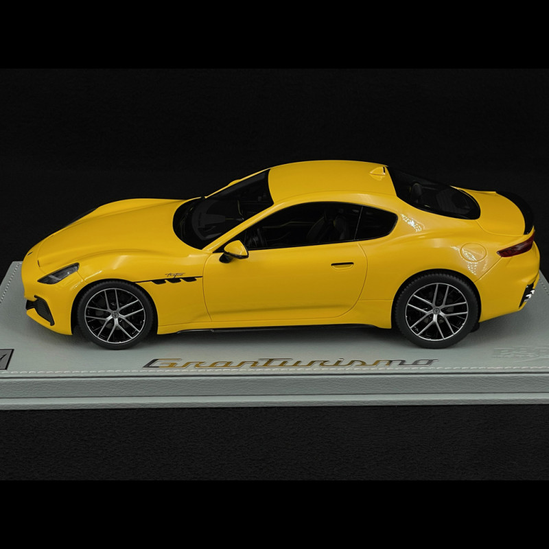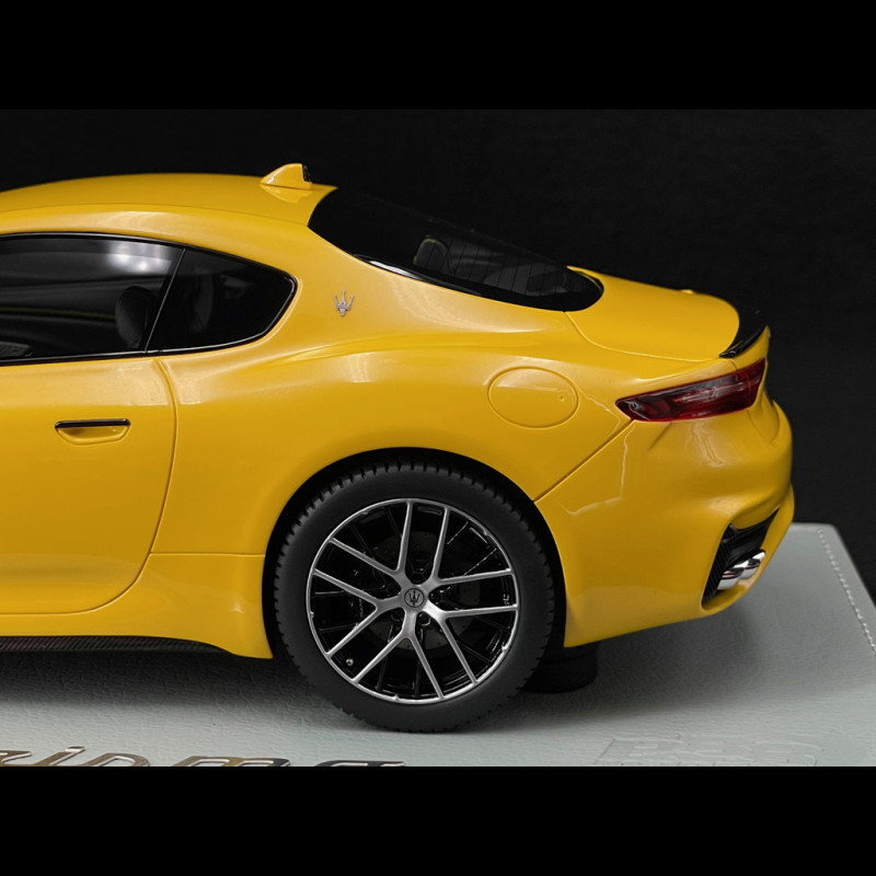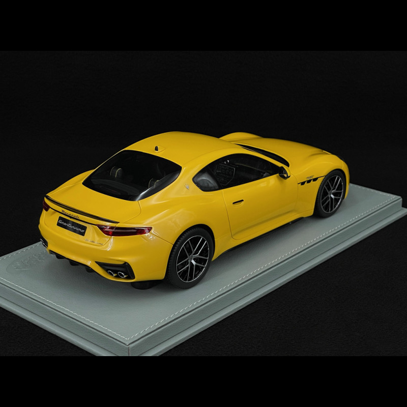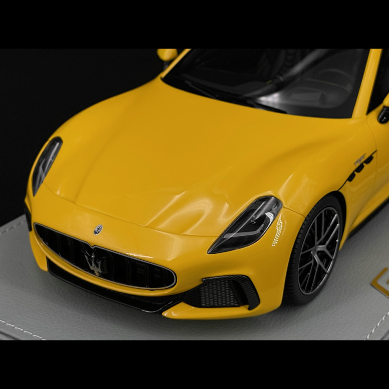 The 1/18 scale Maserati GranTurismo Trofeo 2023 Giallo Corse is a high-quality resin reproduction, without opening parts, that emphasizes the precision of the coupe's volumes, air intakes, and aerodynamic elements. The Giallo Corse livery is applied with a premium finish that highlights the body's curves, while the wheels, brake calipers, headlights, logos, and specific Trofeo signatures are finely detailed to remain as close as possible to the real car. The model is mounted on a hand-stitched eco-leather base with a descriptive plaque, making it a collector's item for fans of modern Italian GTs.
