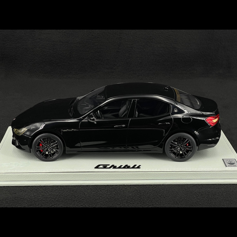 The 1/18 scale 2019 Ghibli Nerissimo faithfully reproduces the clean, sporty lines of the sedan: Trident grille, taut profile, and four-door coupe proportions. The all-black finish highlights the "black pack" character of the real car, with deep paint, black wheels, darkened window surrounds, and tone-on-tone body details, while every element (headlights, logo, exhaust) is finely reproduced. Made of resin and limited to 200 numbered pieces, this assembled miniature is designed as a collector's item, a distillation of the sophisticated and dynamic personality of the Ghibli Nerissimo.