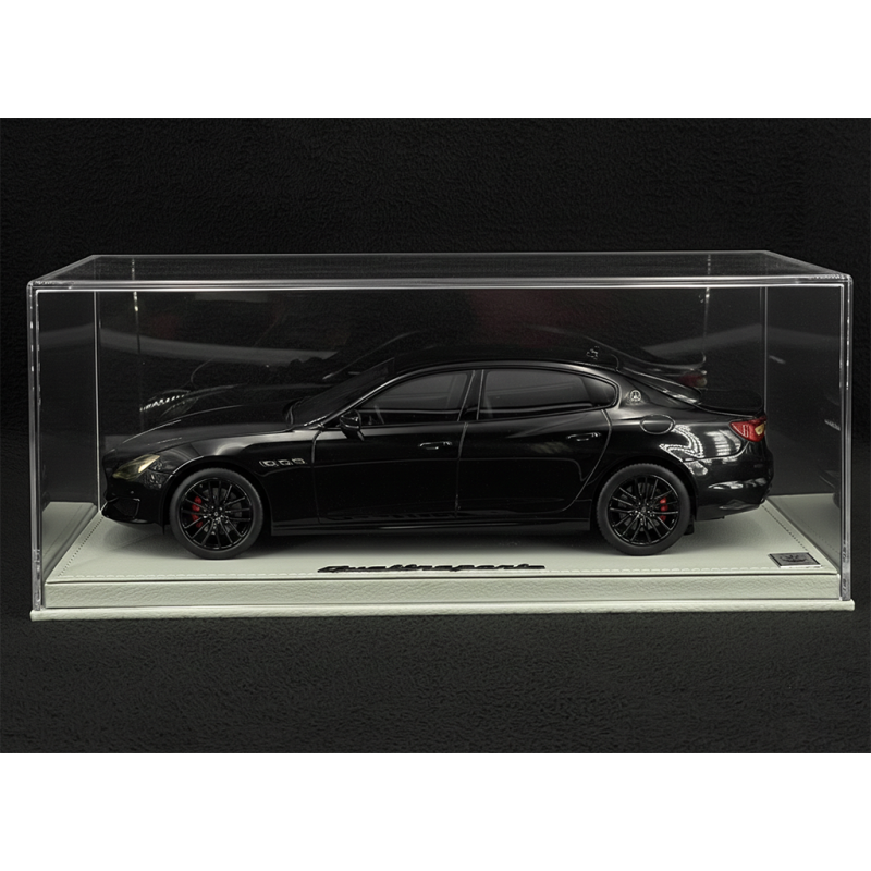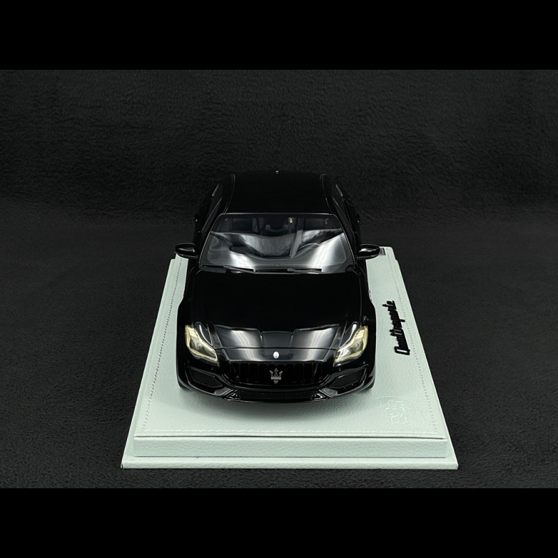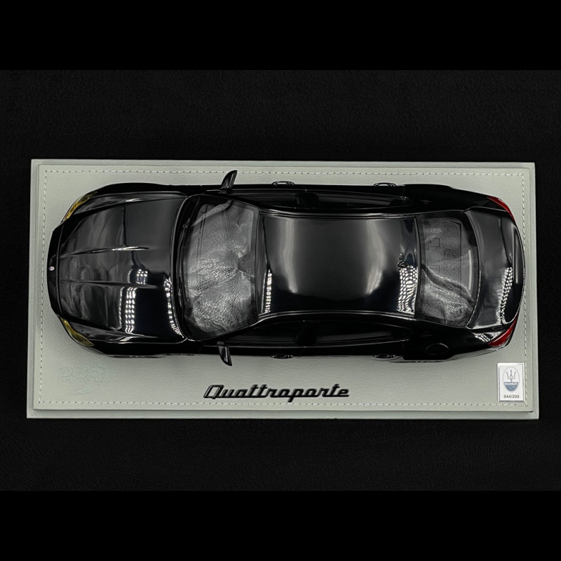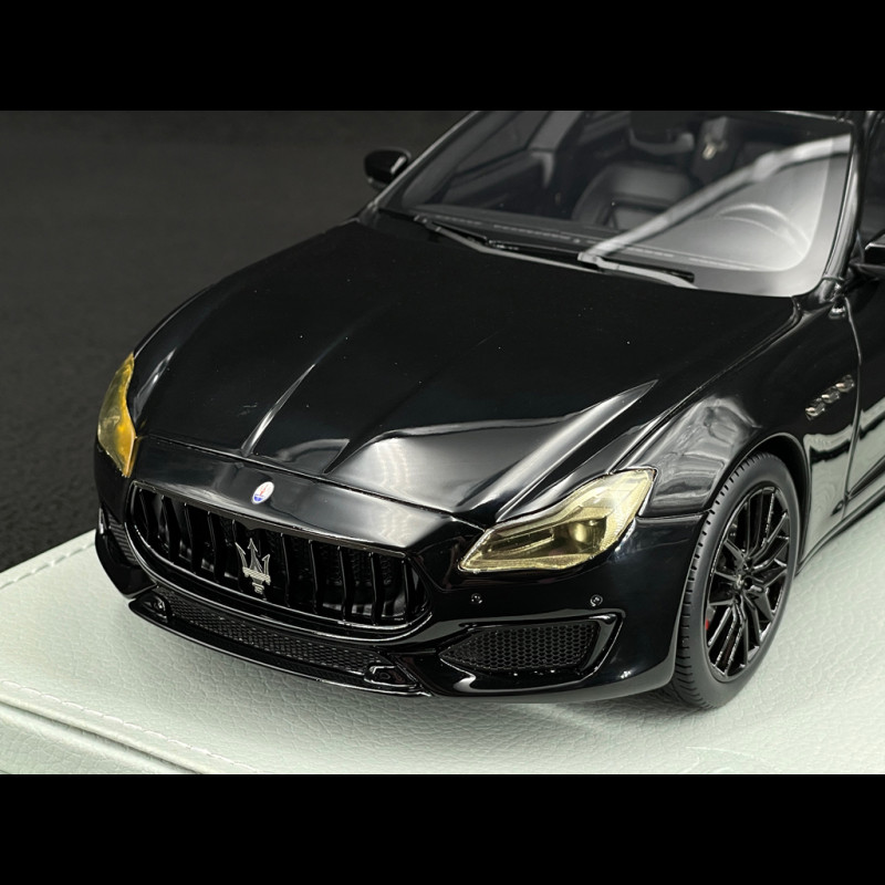 In this 1/18 scale resin version, limited to just 200 unique pieces, all the distinctive details of the Quattroporte Nerissimo are faithfully recreated: its elongated silhouette, Trident grille, black elements, and darkened finishes. The Nerissimo paint is applied using a process similar to that of the real cars, with a deep black enhanced by Black Chrome inserts, while each component (wheels, headlights, logos, exhaust tips) is hand-assembled by specialized personnel. Mounted on a base, this 1:18 scale model presents itself as a true luxury model, designed to showcase the Maserati DNA and the iconic Trident emblem in a collection.