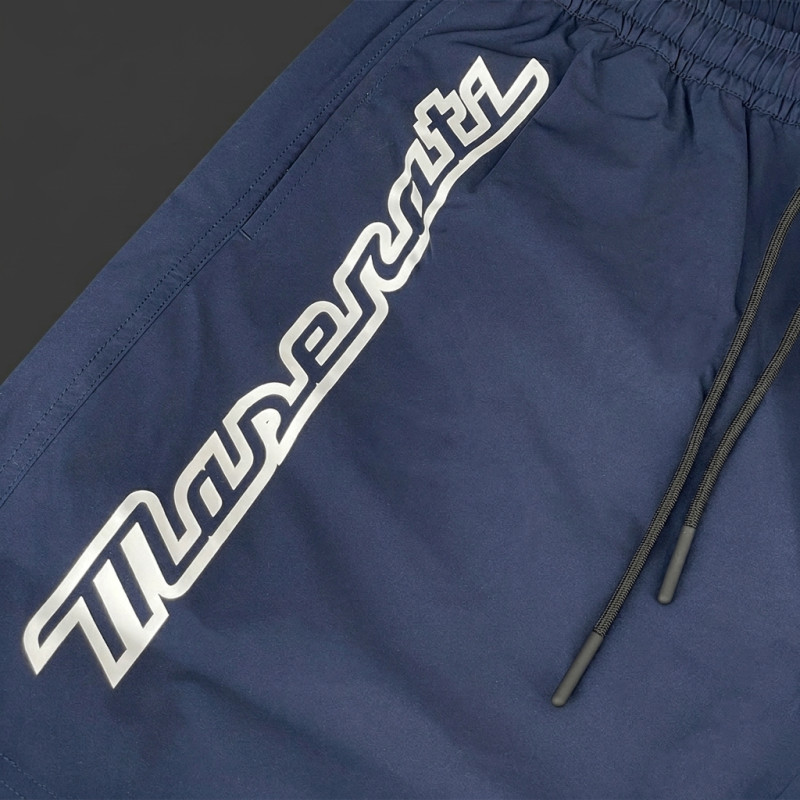 These shorts feature a classic, deep navy blue, instantly reminiscent of the nautical world and Maserati's signature blue. Against this dark background, the contrasting logos and details stand out sharply, creating a sporty-chic look that's more refined than a simple pair of plain beach shorts.