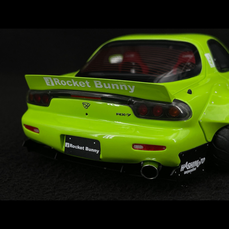 The paint finish and exterior details are particularly meticulous, capturing the aggressive and personalized attitude of the modified RX-7, with its specific sport wheels, pronounced air intakes, and flowing lines amplified by the Rocket Bunny treatment. Every element is reproduced with precision, making this model exceptionally realistic and visually striking.
